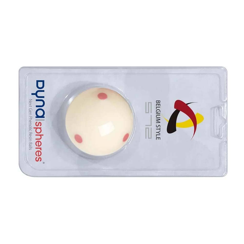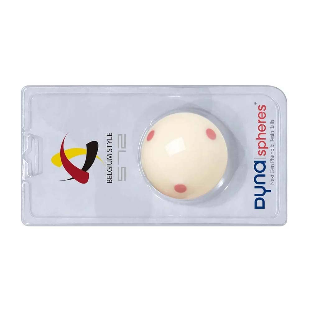 Marca: Dynaspheres. Modelo: Cue Ball Belgium. Tamaño: 57,2 mm +/- 0,08mm. Peso: 169 gramos +/- 1,0 gramo. Densidad: 1,73. Redondez: ? 0,03mm. Dureza: ? 59 Rockwell. Composición: Resina Fenólica. . El producto se compone por 1 bola de billar Dynaspheres Cue Ball Belgium con 6 puntos rojos.