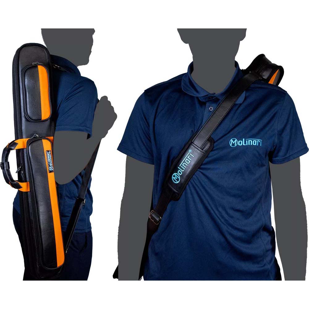 Marca Molinari. Modelo Retro Flat. Capacidad: 2 culatas y 4 flechas. Vinilo negro y naranja con costuras negras. Estructura semirrígida para mayor protección. Cremalleras internas de longitud completa. Divisiones removibles configurables. Bolsillo ventilado para guantes y toalla. Dos bolsillos frontales: 20 cm y 46 cm. Correa de hombro cómoda, ancha y desmontable. Dimensiones: 85 x 13 x 10 cm. Peso: 2,75 kg. . El producto se compone por 1 funda de taco de billar Molinari Retro Flat, no incluye tacos ni repuestos, es solo la funda.