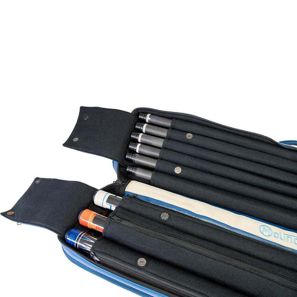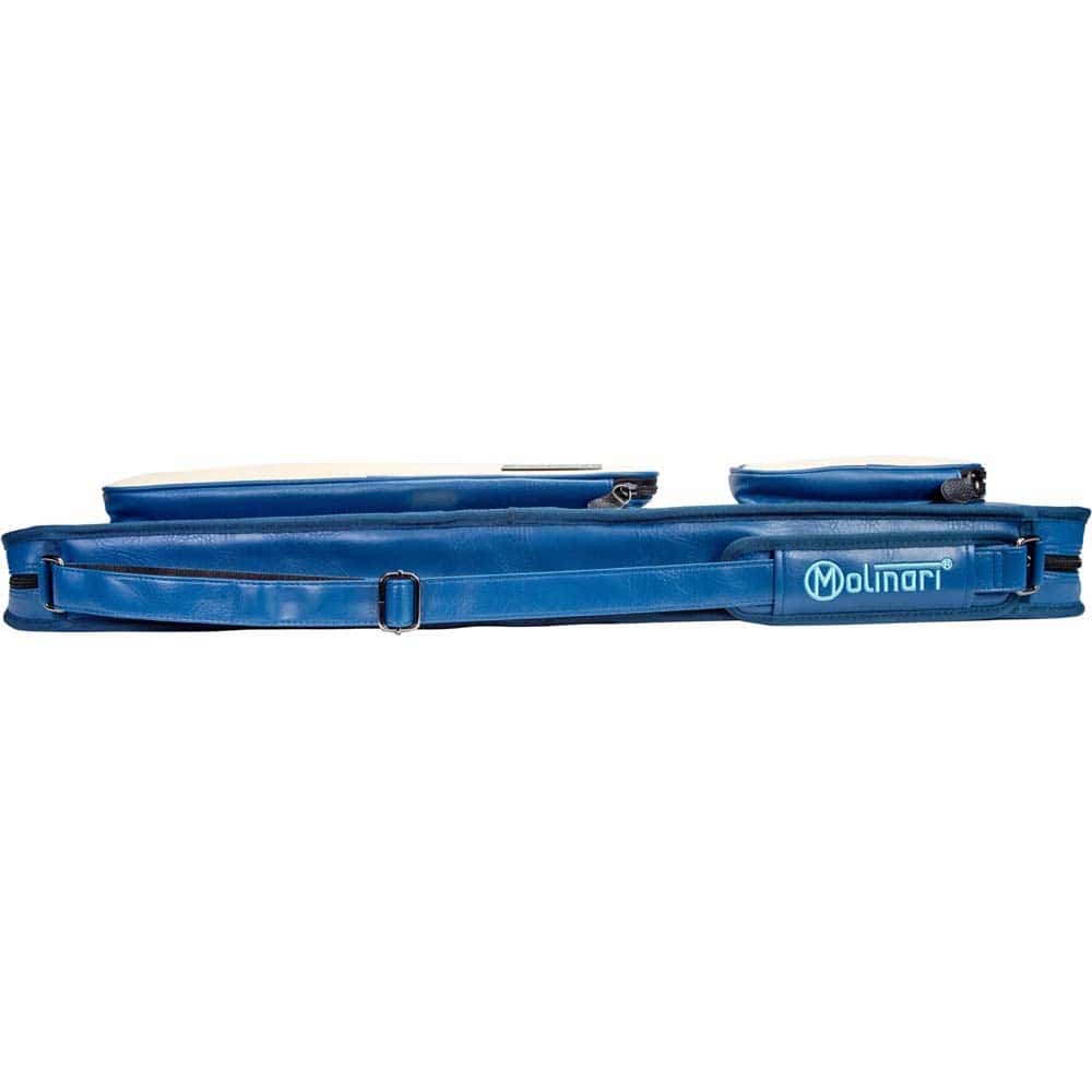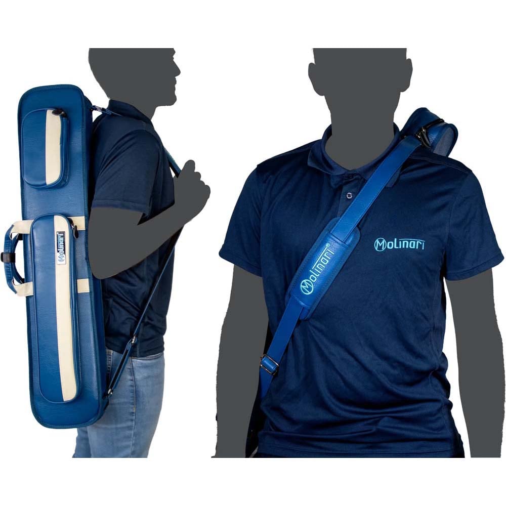 Marca Molinari. Modelo Retro Soft. Capacidad para 3 porras y 6 flechas. Diseño en vinilo azul y beige con costuras negras. Incluye correa de hombro para transporte cómodo. Bolsillo separado para tizas, extensiones y accesorios. 2 bolsillos frontales: 20 cm (pequeño) y 44 cm (grande). Dimensiones: 86 x 16 x 10 cm. Peso: 2,425 kg. . El producto se compone por 1 funda de taco de billar Molinari Retro Soft, no incluye tacos ni repuestos, es solo la funda.