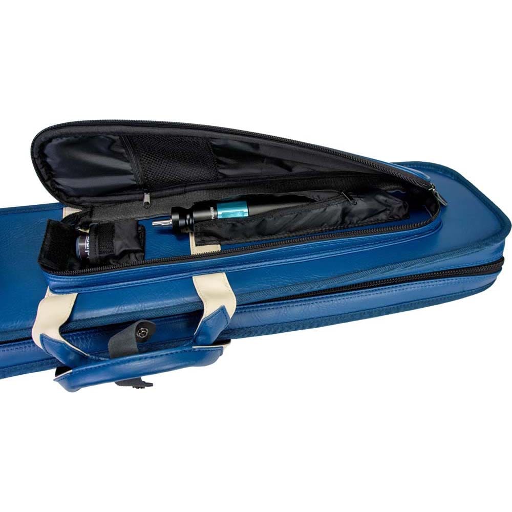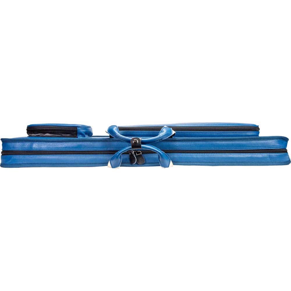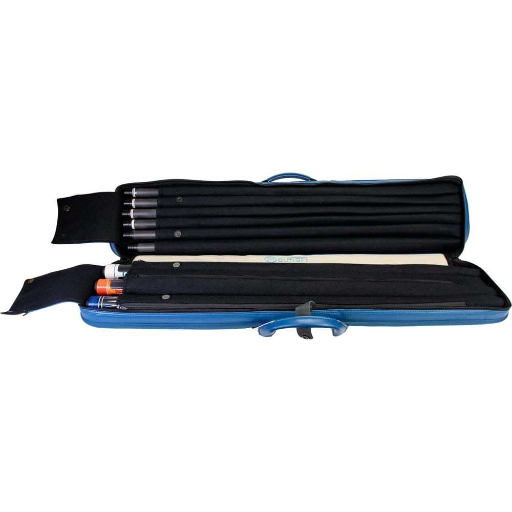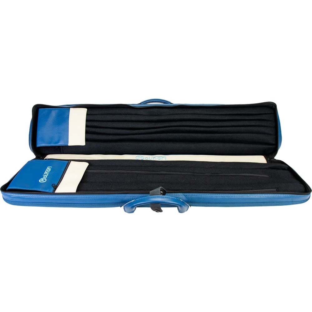 Marca Molinari. Modelo Retro Soft. Capacidad para 3 porras y 6 flechas. Diseño en vinilo azul y beige con costuras negras. Incluye correa de hombro para transporte cómodo. Bolsillo separado para tizas, extensiones y accesorios. 2 bolsillos frontales: 20 cm (pequeño) y 44 cm (grande). Dimensiones: 86 x 16 x 10 cm. Peso: 2,425 kg. . El producto se compone por 1 funda de taco de billar Molinari Retro Soft, no incluye tacos ni repuestos, es solo la funda.
