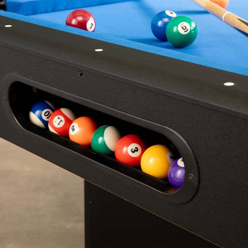 La mesa de billar San Diego destaca por su apariencia, artesanía y jugabilidad. Su elegante acabado en madera negra, con elegantes esquinas y paneles de base cromados, le confiere un aspecto moderno y de alta calidad. Además, su acabado es especialmente fácil de limpiar y duradero, ideal tanto para el hogar como para instalaciones juveniles y recreativas. La base sólida y extremadamente estable integra un sistema de retorno de bola automático y silencioso. La placa de material de aproximadamente 20 mm de grosor, junto con un revestimiento especial, crea una superficie de juego estable y precisa. Para garantizar una superficie de juego completamente libre de vibraciones, se incorporaron refuerzos transversales adicionales al cuerpo. Los resistentes cojines de caucho natural garantizan un rebote preciso de la bola. La altura y el ángulo de incidencia de los cojines cumplen con las normas oficiales. La tela de lana azul de alta calidad se desliza rápidamente y es, además, muy robusta y duradera. La San Diego logra su alta estabilidad gracias a sus sólidas patas de viga. Estas están equipadas con grandes pies de disco cromados en el extremo de los pies, lo que permite un ajuste perfecto de la mesa incluso en superficies irregulares. La mesa San Diego se entrega premontada: solo es necesario fijar las dos patas laterales a la base. Para mayor comodidad, se puede transformar en una mesa de comedor o de trabajo en segundos con la placa de cubierta de dos piezas a juego (artículo n.º 5522.01), con aproximadamente 62 cm de espacio para las piernas. Incluye todos los accesorios: un juego de bolas de torneo (57 mm), dos tacos (145 cm), un juego de triángulos y tiza de billar. Dimensiones: Medida exterior 225 x 125 cm, altura 82 cm, superficie de juego 200 x 100 cm, peso aproximado: 110 kg. Color del paño: Azul Color del cuerpo: Negro Bandas: Caucho natural Ensamblado: Premontado / autoensamblado Salida de bolas: Devolución de bolas Espesor de la placa del campo de juego: 20 milímetros Peso neto: 110 kilos Tamaño del campo de juego: 7 pies (200 x 100 cm) La entrega se realizará en palets mediante transportista. Se puede añadir como extra: Placa de cubierta + 119,95 € —– Transporte: La mercancía recibida debe ser revisada por el cliente en el mismo momento en que la agencia de transporte realiza la entrega, si a simple vista se observa que tiene golpe, no aceptar la entrega y que el transportista se la lleve de nuevo. Si se revisa y el embalaje está en perfecto estado anotar en el albarán siempre “bulto golpeado” antes de firmar, esto se hace para estar protegido cara el seguro del transporte ante cualquier daño que sufra el pedido en el transporte y no se pueda observar a simple vista. Ante cualquier percance comunicarlo en un plazo máximo de 24 horas al correo electrónico manuelgil@manuelgil.com o al teléfono 96 366 10 98 de 10:00h a 13:30h. La entrega se realiza puerta a puerta. Las agencias de transporte no ofrecen la posibilidad de subir a ningún piso o habitación. *** No se podrán admitirán reclamaciones si no ha hecho constar nada en el albarán de entrega del transportista***—– —– Plazo de entrega: Producto con plazo previsto de recepción de 15 a 30 dias.—–