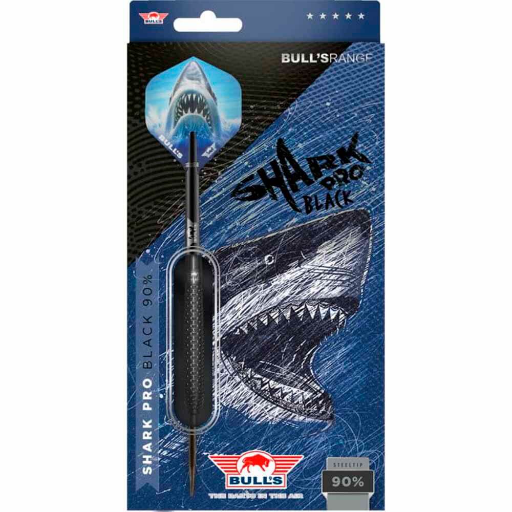 Marca: Bulls NL. Modelo: Shark Pro. Versión: Black. Material: Tungsteno . Peso total: 24gr aprox. Longitud barril: 48.3mm. Diámetro barril: 7.25mm. Tipo de punta: Metal – Steel Tip. Rosca de caña: 2ba 4mm. . El juego de dardos se compone por 1 set de 3 cuerpos Shark Pro Black con punta de acero, 1 set de 3 cañas Nylon Medium Negro y 1 set de 3 plumas