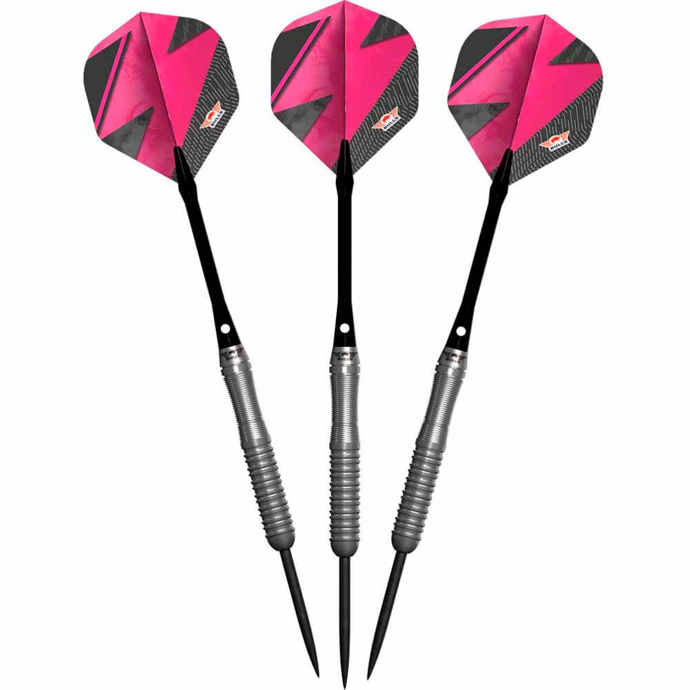 Marca: Bulls NL. Modelo: Lightning . Versión: Pink . Material: Tungsteno 80%. Peso total: 24gr aprox. Longitud barril: 50.0mm. Diámetro barril: 7.10mm. Tipo de punta: Metal – Steel Tip. Rosca de caña: 2ba 4mm. . El juego de dardos se compone por 1 set de 3 cuerpos Lightning Pink con punta de acero, 1 set de 3 cañas Nylon y 1 set de 3 plumas