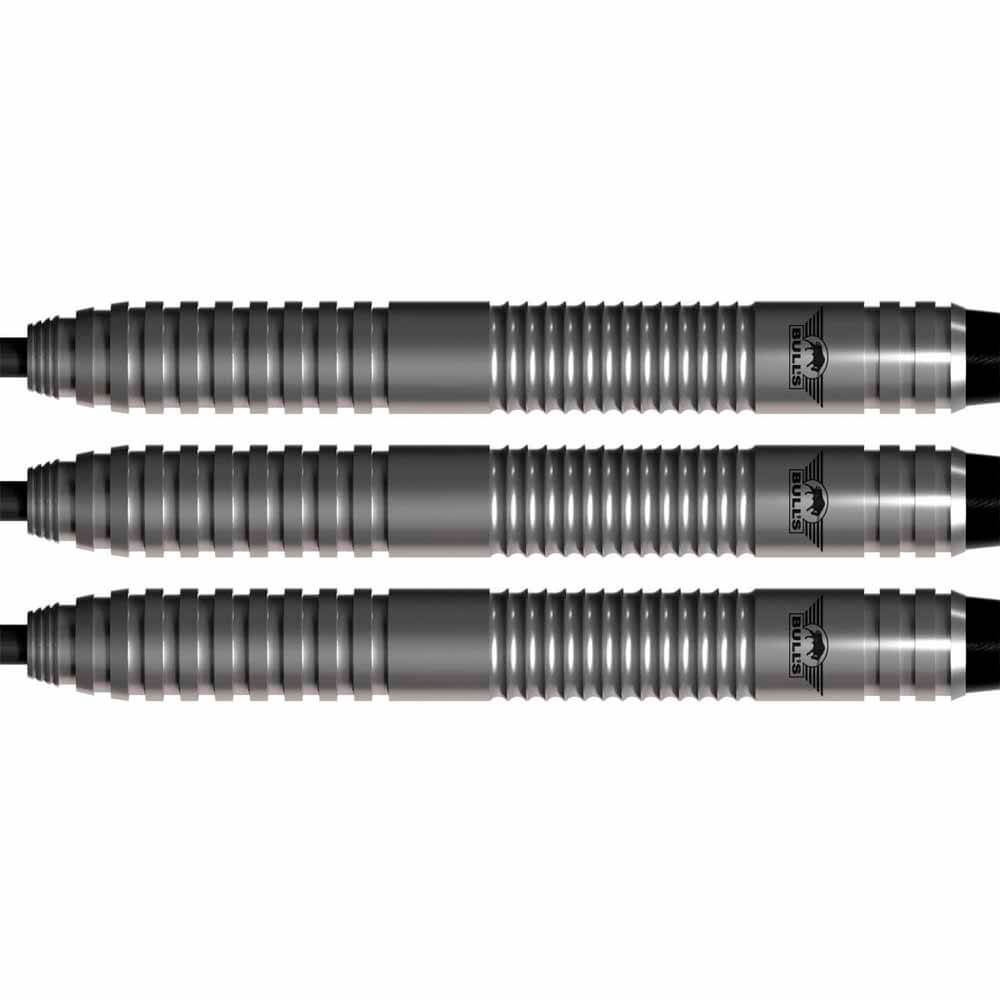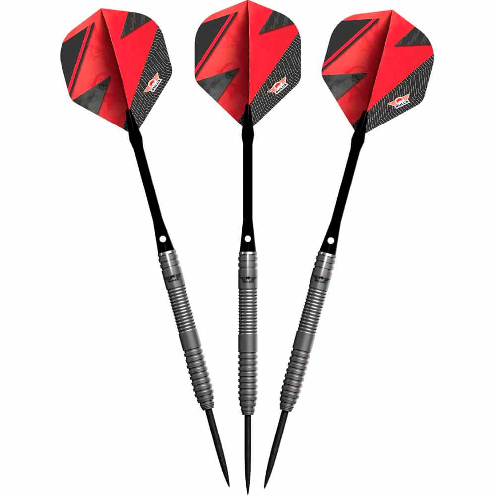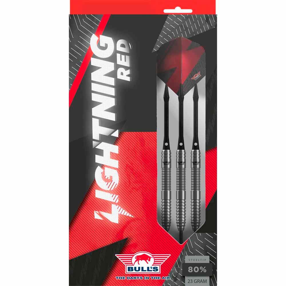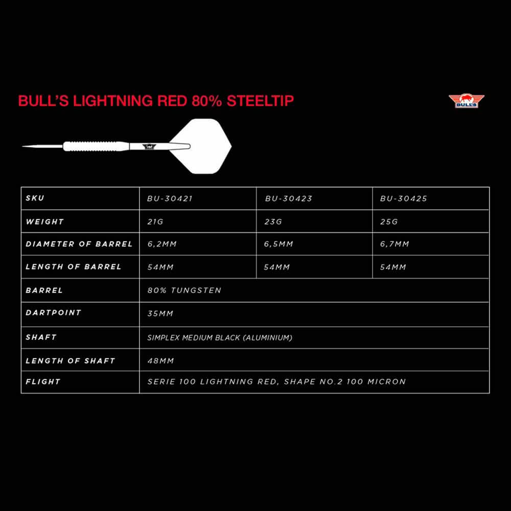 Marca: Bulls NL. Modelo: Lightning . Versión: Red . Material: Tungsteno 80%. Peso total: 22gr aprox. Longitud barril: 54.0mm. Diámetro barril: 6.50mm. Tipo de punta: Metal – Steel Tip. Rosca de caña: 2ba 4mm. . El juego de dardos se compone por 1 set de 3 cuerpos Lightning Red con punta de acero, 1 set de 3 cañas Nylon Medium Negro y 1 set de 3 plumas