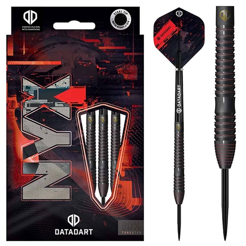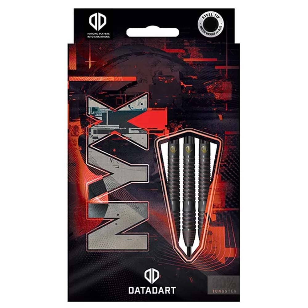 Marca: Datadart. Modelo: NYX. Material barril: 90% Tungsteno . Peso barril: 25g . Medidas: Largo 52.0mm Ancho 7.1mm . Punta: Metal ( Steel Tip ). . El juego de dardos se compone por 1 set de 3 cuerpos de dardos Datadart NYX con punta de metal, 1 set de 3 cañas y 1 set de 3 plumas Datadart.