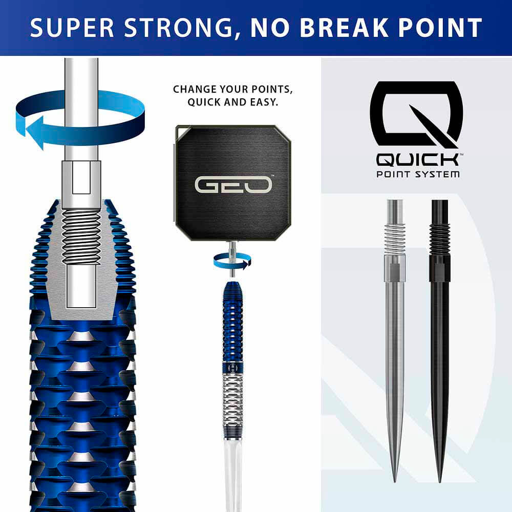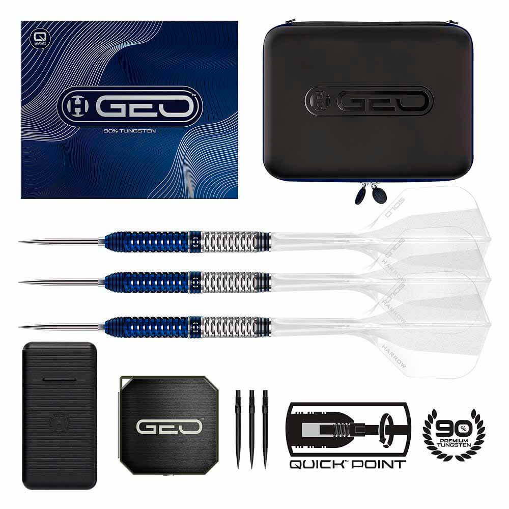 Marca: Harrows. Modelo: Geo 01. Diseño: Parallel. Longitud: 50mm. Diametro: 6.9mm. Peso total: 23g. Peso cuerpo aprox: 21.5g. Material: 90% Tungsteno. Rosca Caña: 2ba. Precision peso: +/- 0.05G. . El juego de dardos se compone por 1 set de 3 cuerpos Harrows Darts Geo , 1 set de 3 cañas Supergrip , 1 set de 3 plumas Impact, 2 juego de puntas Quick y 1 herramienta de punta rápida incluida con dardos con punta de acero
