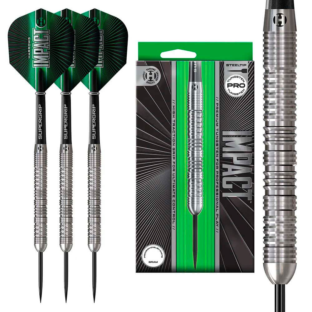 Longitud: 54mm. Diametro: 6.75mm. Peso total: 23g. Peso cuerpo aprox: 21.5g. Material: 70% Tungsteno. Rosca Caña: 2ba. Precision peso: +/- 0.05G. . El juego de dardos se compone por 1 set de 3 cuerpos Harrows Darts Impact , 1 set de 3 cañas Supergrip y 1 set de 3 plumas Impact
