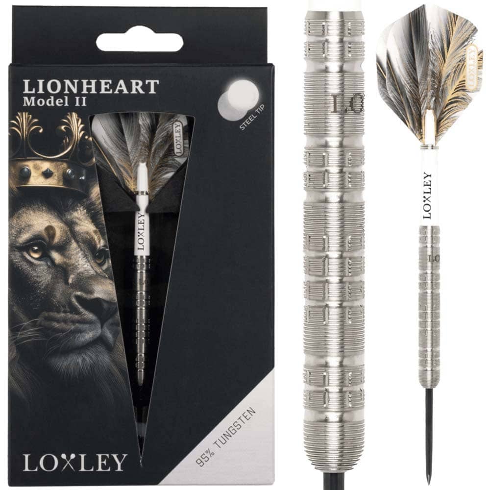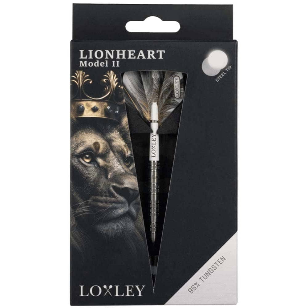 Marca: Loxley Darts. Modelo: Lionheart Model 2. Material: 90% Tungsteno. Peso barril: 22 gramos. Punta: Acero – Steel Tip. Medida: 48.6mm x 6.35mm. . El producto se compone por 1 juego de 3 dardos Loxley Darts Lionheart con punta de acero, 1 set de 3 cañas Loxley y 1 set de 3 plumas Loxley