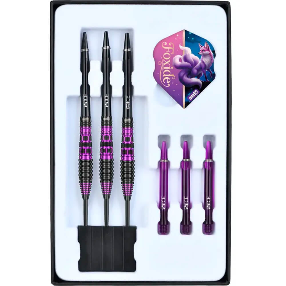 Marca: One 80. Modelo: Foxide . Version: F2. Largo Barril: 43.5mm. Diámetro Barril: 7.7mm. Peso del cuerpo: 22 gramos. Material Barril: 90% Tungsteno. . El juego de dardos Foxide F2 se compone por 1 set de 3 cuerpos, 1 set de 3 cañas y 1 set de 3 plumas