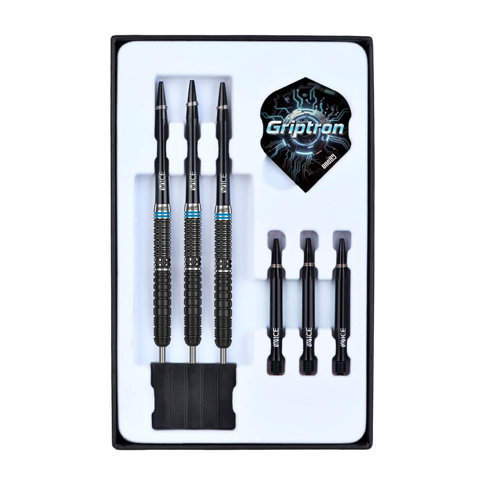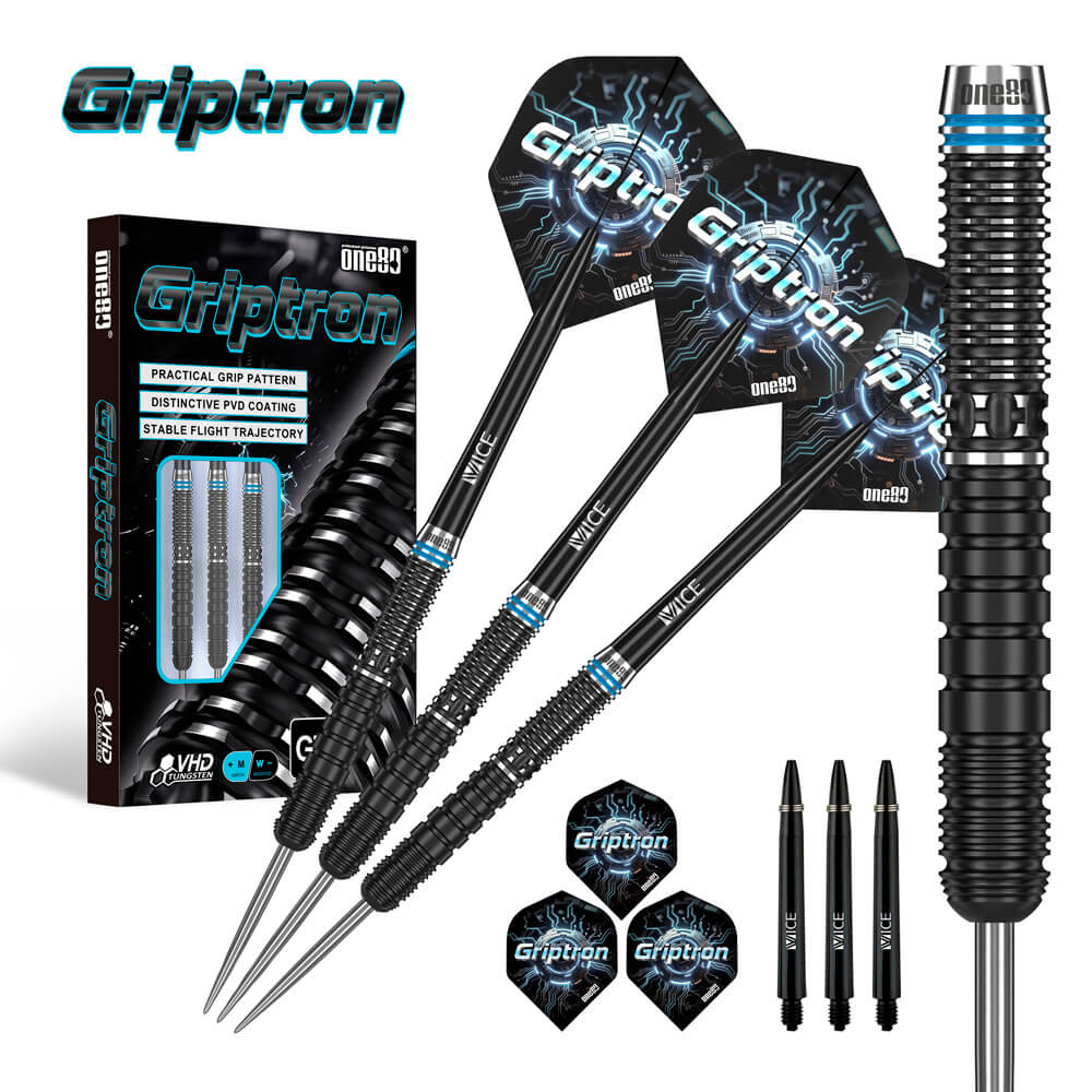 Marca: One 80. Modelo: Griptron . Versión: GT4. Largo Barril: 51mm. Diámetro Barril: 6.7mm. Peso del cuerpo: 22 gramos. Material Barril: 90% Tungsteno. . El juego de dardos Griptron GT4 se compone por 1 set de 3 cuerpos, 1 set de 3 cañas y 1 set de 3 plumas