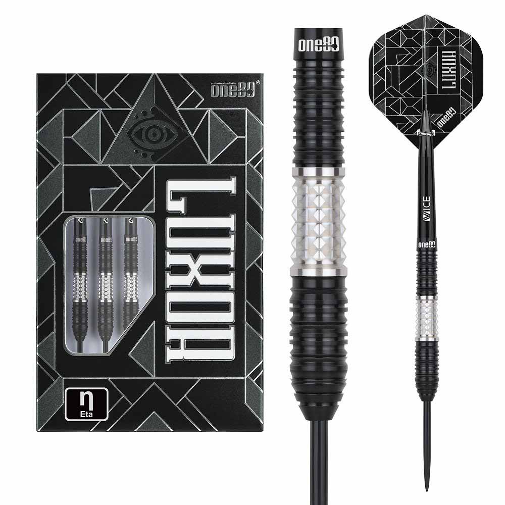 Marca: One 80. Modelo: Eta. Version: II. Largo Barril: max 48.0mm. Diámetro Barril: max 7.2mm. Peso del cuerpo: 22 gramos. Material Barril: 90% Tungsteno. . El juego de dardos Luxor Eta II se compone por 1 set de 3 cuerpos, 1 set de 3 cañas y 1 set de 3 plumas