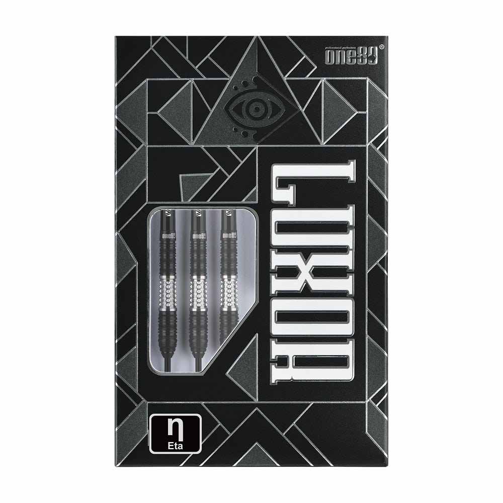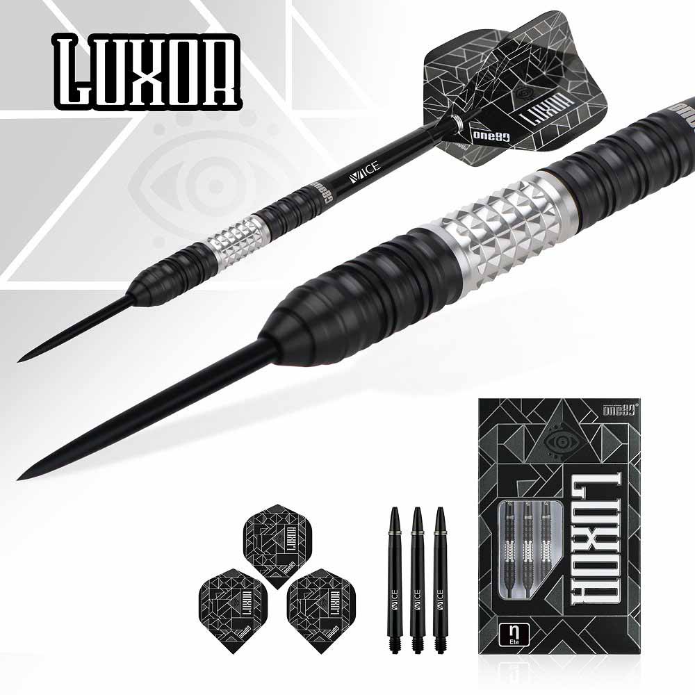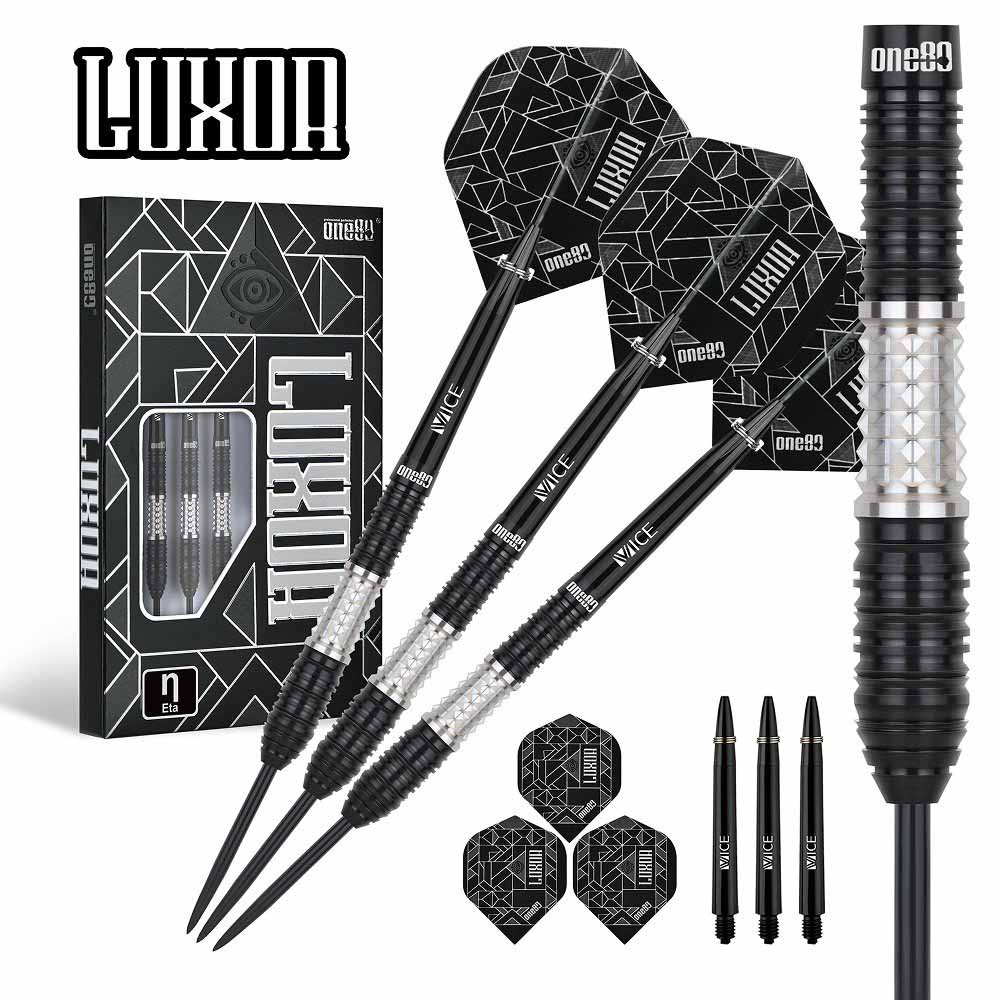 Marca: One 80. Modelo: Eta. Version: II. Largo Barril: max 49.0mm. Diámetro Barril: max 7.4mm. Peso del cuerpo: 24 gramos. Material Barril: 90% Tungsteno. . El juego de dardos Luxor Eta II se compone por 1 set de 3 cuerpos, 1 set de 3 cañas y 1 set de 3 plumas