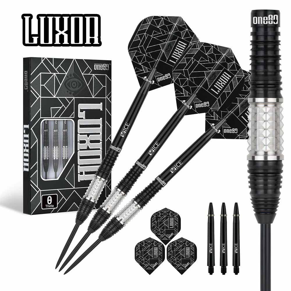 Marca: One 80. Modelo: Theta . Version: II. Largo Barril: max 45.0mm. Diámetro Barril: max 7.6mm. Peso del cuerpo: 22 gramos. Material Barril: 90% Tungsteno. . El juego de dardos Luxor Theta II se compone por 1 set de 3 cuerpos, 1 set de 3 cañas , 1 set de 3 plumas y 1 set de 3 puntas 2ba.