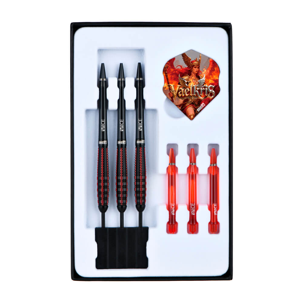 Marca: One 80. Modelo: Vaelkris. Versión: V05 Steeltip. Largo Barril: 43mm. Diámetro Barril: 7.7mm. Peso del cuerpo: 23 gramos. Material Barril: 90% Tungsteno. . El juego de dardos Vaelkris V05 se compone por 1 set de 3 cuerpos, 1 set de 3 cañas y 1 set de 3 plumas