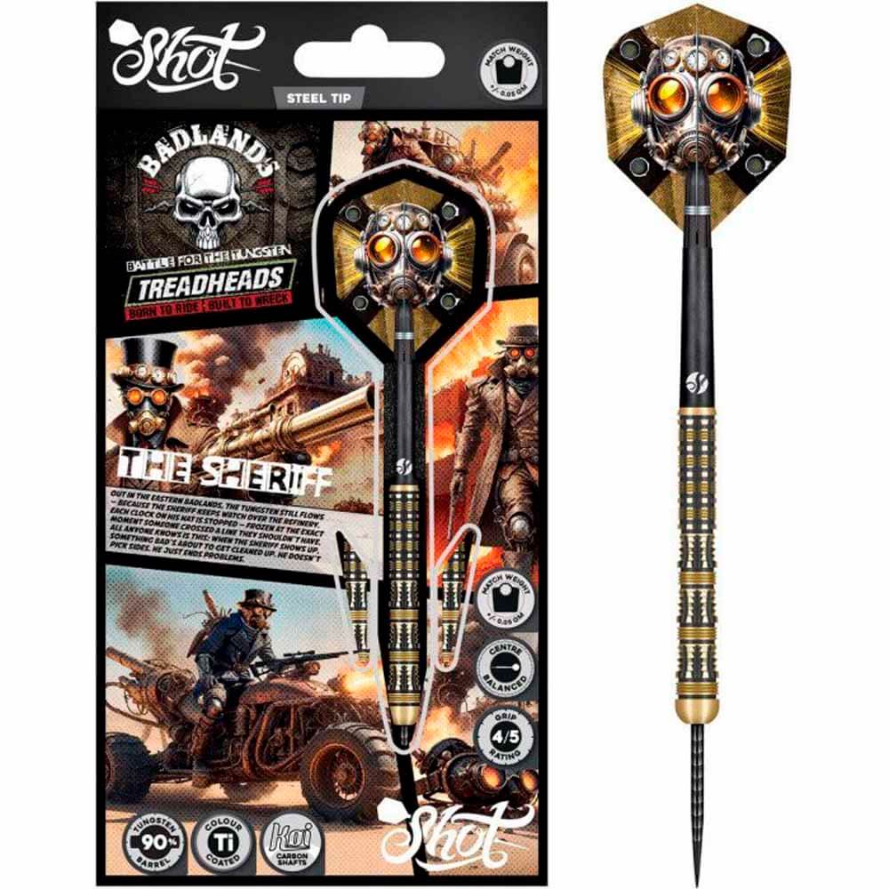 Marca: Shot. Modelo: Badlands The Sheriff. Peso total: 23gr aprox. Longitud Barril: 52.0mm. Diámetro Barril: 7.3mm. Material: Tungsteno 90%. Tipo de punta: Metal – Steel Tip. . El dardos se compone por 1 ser de 3 cuerpos Badlands The Sheriff con punta de acero, 1 ser de 3 cañas Shot y 1 set de 3 plumas Shot.