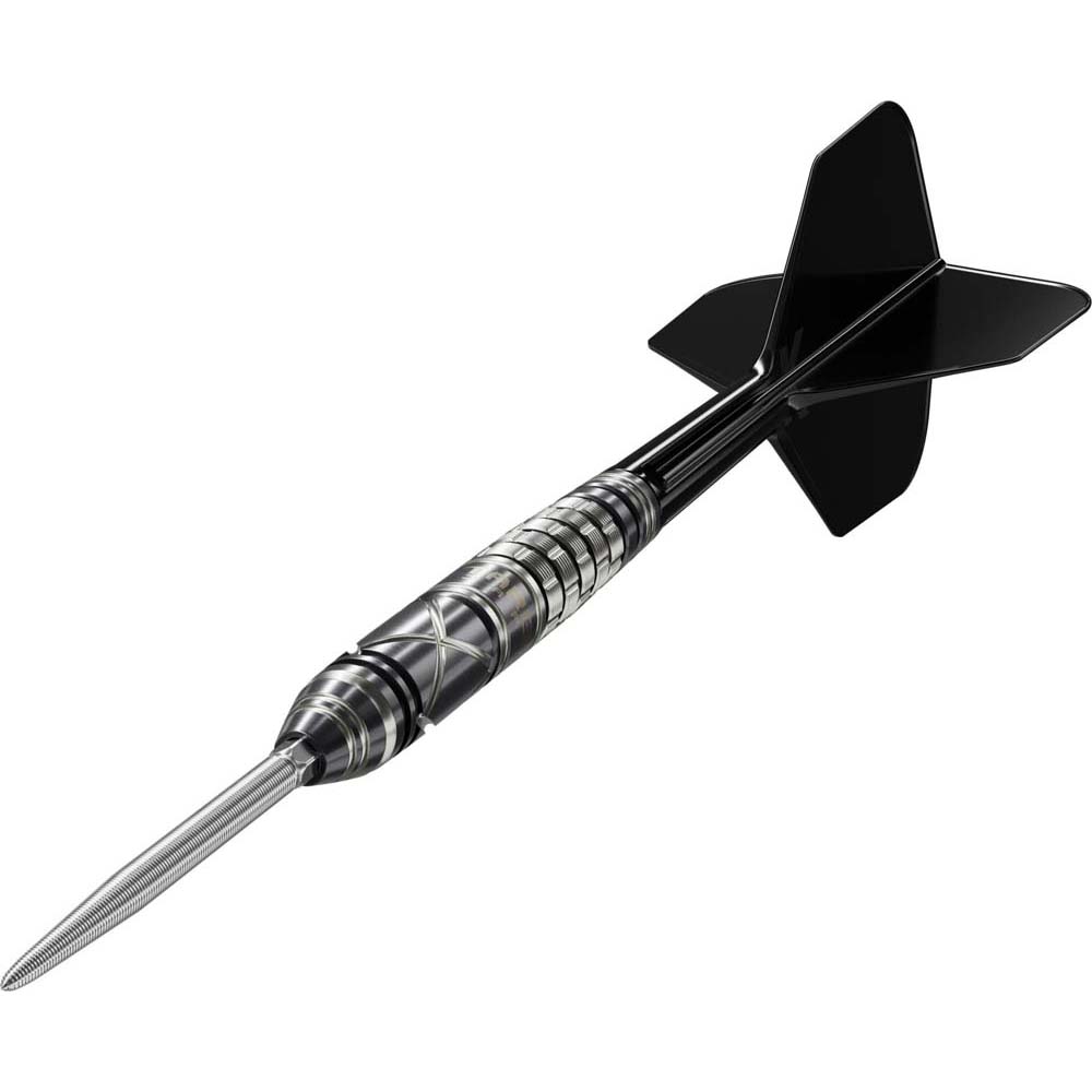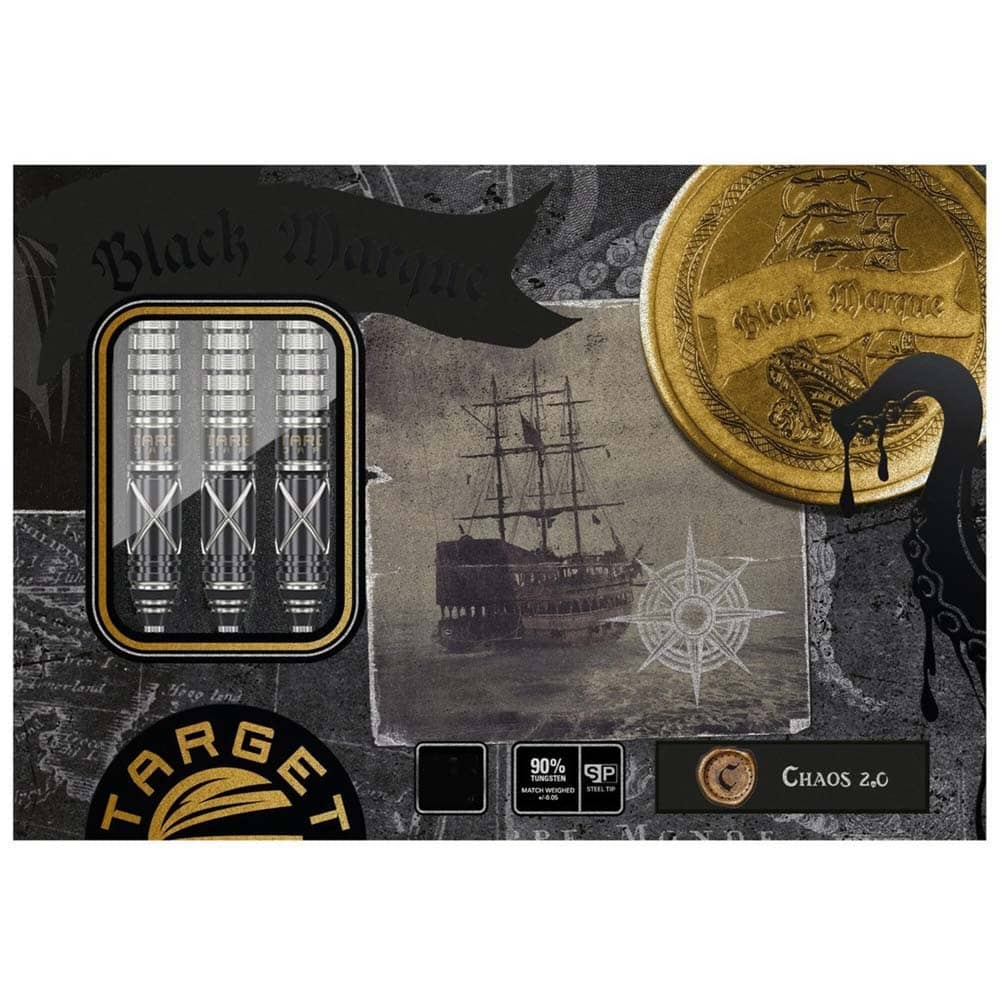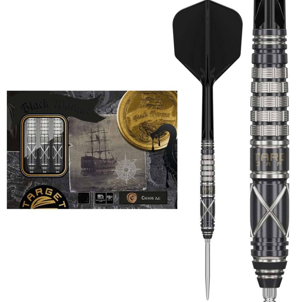 Marca: Target Japan. Modelo: Black Marque Chaos 2.0. Diseño: Leonard Chai, Lenny. Peso barril: 23 gramos. Material: Tungsteno 90%. Longitud barril: 45.00mm. Diámetro barril: 7.10mm. Tipo de punta: Punta de acero intercambiable Target Swiss Point. Rosca de la caña: 2BA. . El juego de dardos se compone por 1 set de 3 cuerpos Target Japan Black Marque Chaos 2.0 con punta de acero Target Swiss Point y 1 set de 3 plumas K-Flex Target Japan.