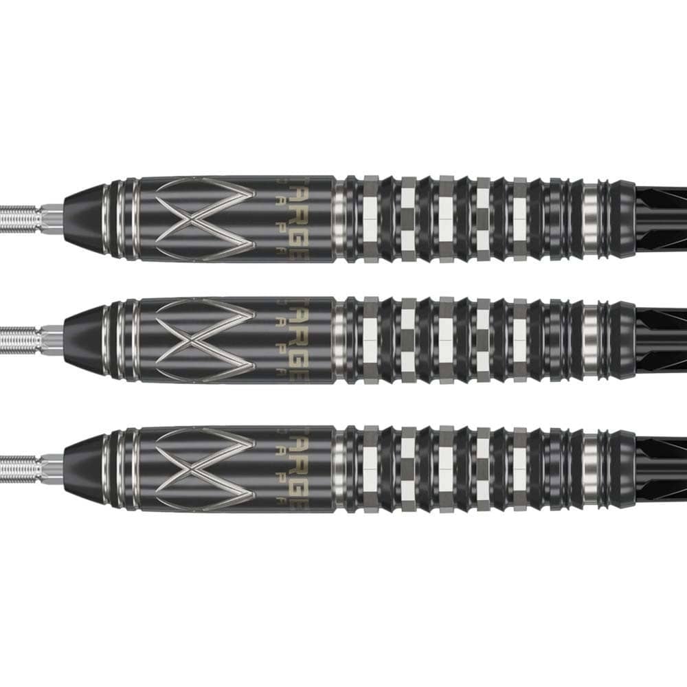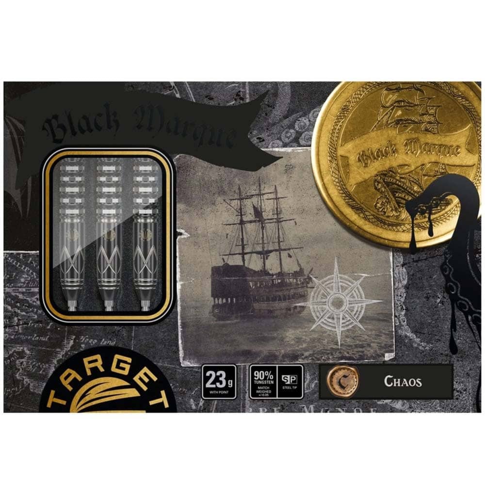 Marca: Target Japan. Modelo: Black Marque Chaos. Diseño: Leonard Chai, Lenny. Peso barril: 23 gramos. Material: Tungsteno 90%. Longitud barril: 45.50mm. Diámetro barril: 7.00mm. Tipo de punta: Punta de acero intercambiable Target Swiss Point. Rosca de la caña: 2BA. . El juego de dardos se compone por 1 set de 3 cuerpos Target Japan Black Marque Chaos con punta de acero Target Swiss Point y 1 set de 3 plumas K-Flex Target Japan.