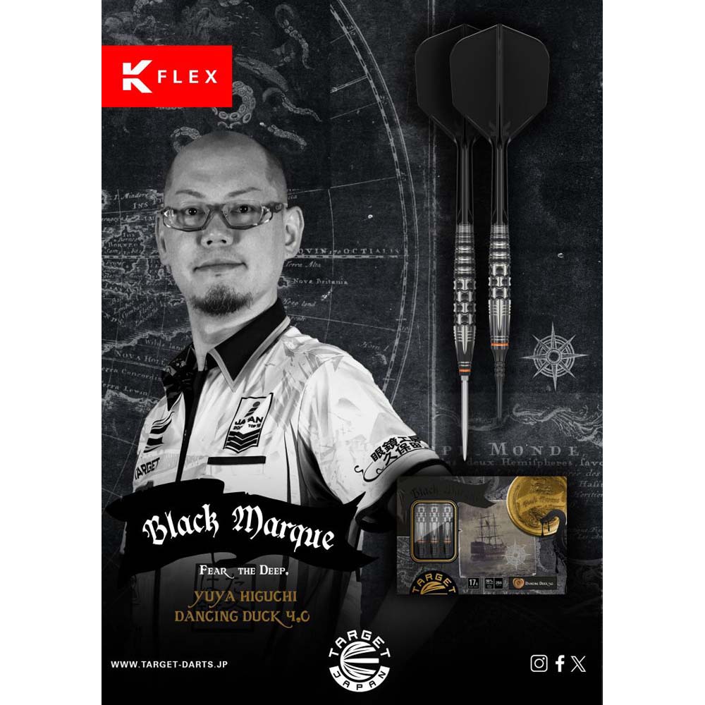 Marca: Target Japan. Modelo: Dancing Duck G4. Diseño: Yuya Higuchi. Peso barril: 24 gramos. Material: Tungsteno 90%. Longitud barril: 49.7mm. Diámetro barril: 7.5mm. Tipo de punta: Punta de acero con rosca intercambiable Target Swiss Point. Rosca de la caña: 2ba. . El juego de dardos se compone por 1 set de 3 cuerpos Target Japan Black Marque Dancing Duck G4 con punta de acero Target Swiss, y 1 set de 3 plumas K-Flex Target Japan.