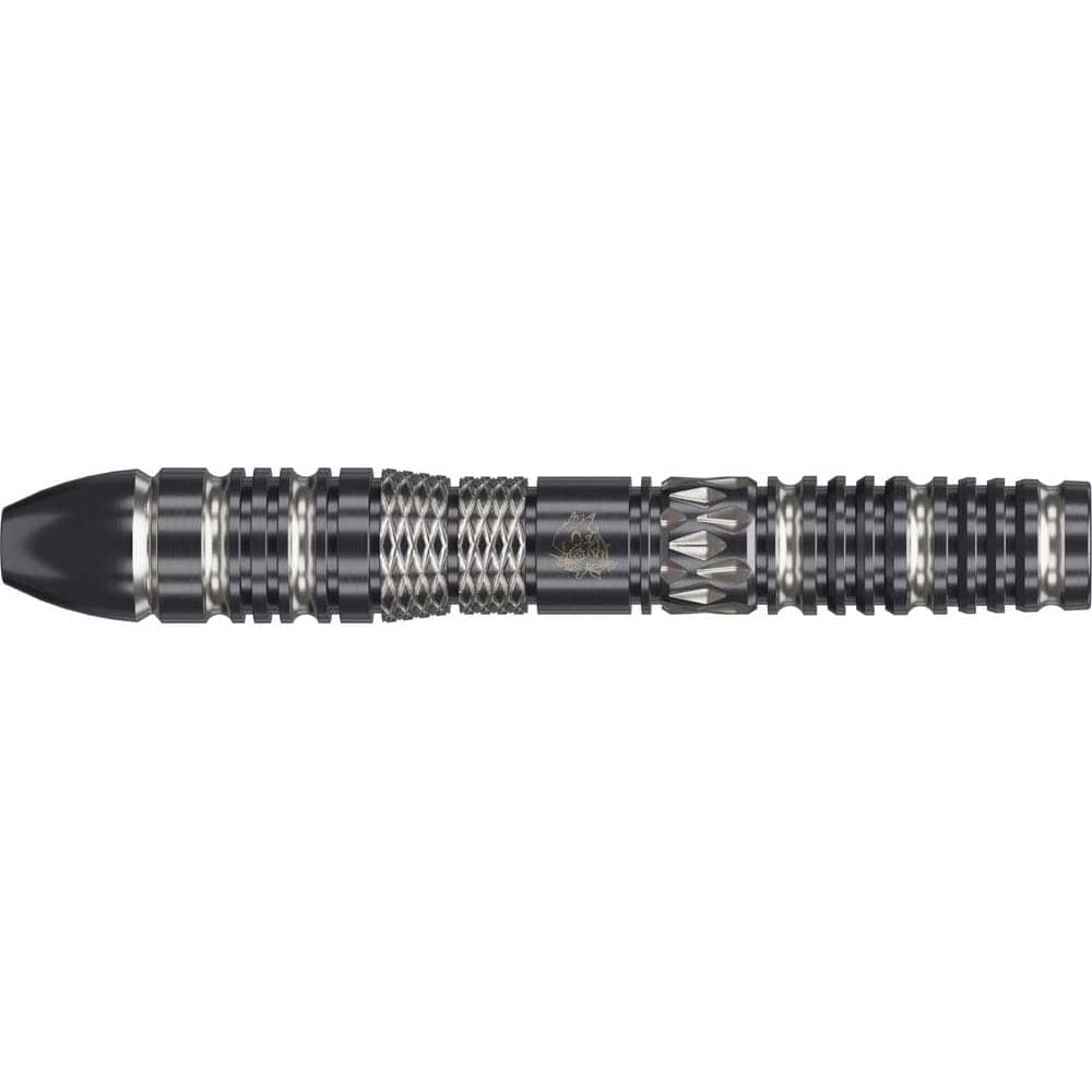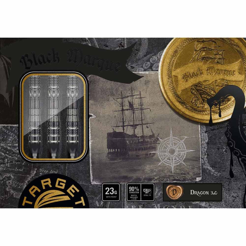 Marca: Target Japan. Modelo: Black Marque Dragon 3.0. Diseño: Leslie Lee. Peso barril: 23 gramos. Material: Tungsteno 90%. Longitud barril: 49.20mm. Diámetro barril: 7.05mm. Tipo de punta: Target Swiss Point, punta de acero intercambiable con rosca. Rosca de la caña: 2BA. . El juego de dardos se compone por 1 set de 3 cuerpos Target Japan Black Marque Dragon 3.0 con punta de acero Target Swiss y 1 set de 3 plumas K-Flex Target Japan.