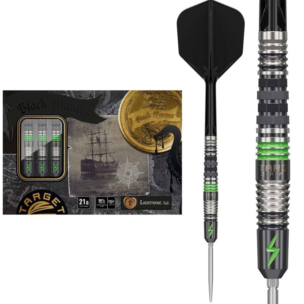 Marca: Target Japan. Modelo: Black Marque Lightning 3.0. Diseño: Chris Lim. Peso barril: 21 gramos. Material: Tungsteno 90%. Longitud barril: 50.00mm. Diámetro barril: 6.60mm. Tipo de punta: Punta de acero intercambiable Target Swiss Point. Rosca de la caña: 2BA. . El juego de dardos se compone por 1 set de 3 cuerpos Target Japan Black Marque Lightning 3.0 con punta de acero Target Swiss Point y 1 set de 3 plumas K-Flex Target Japan.