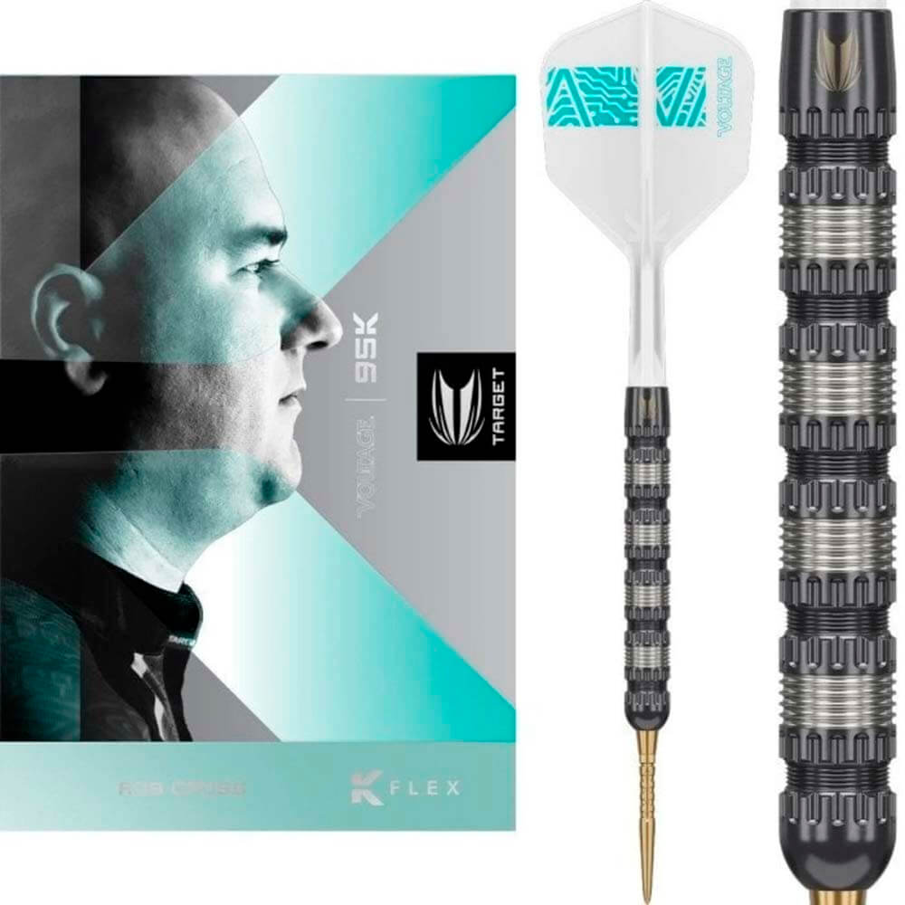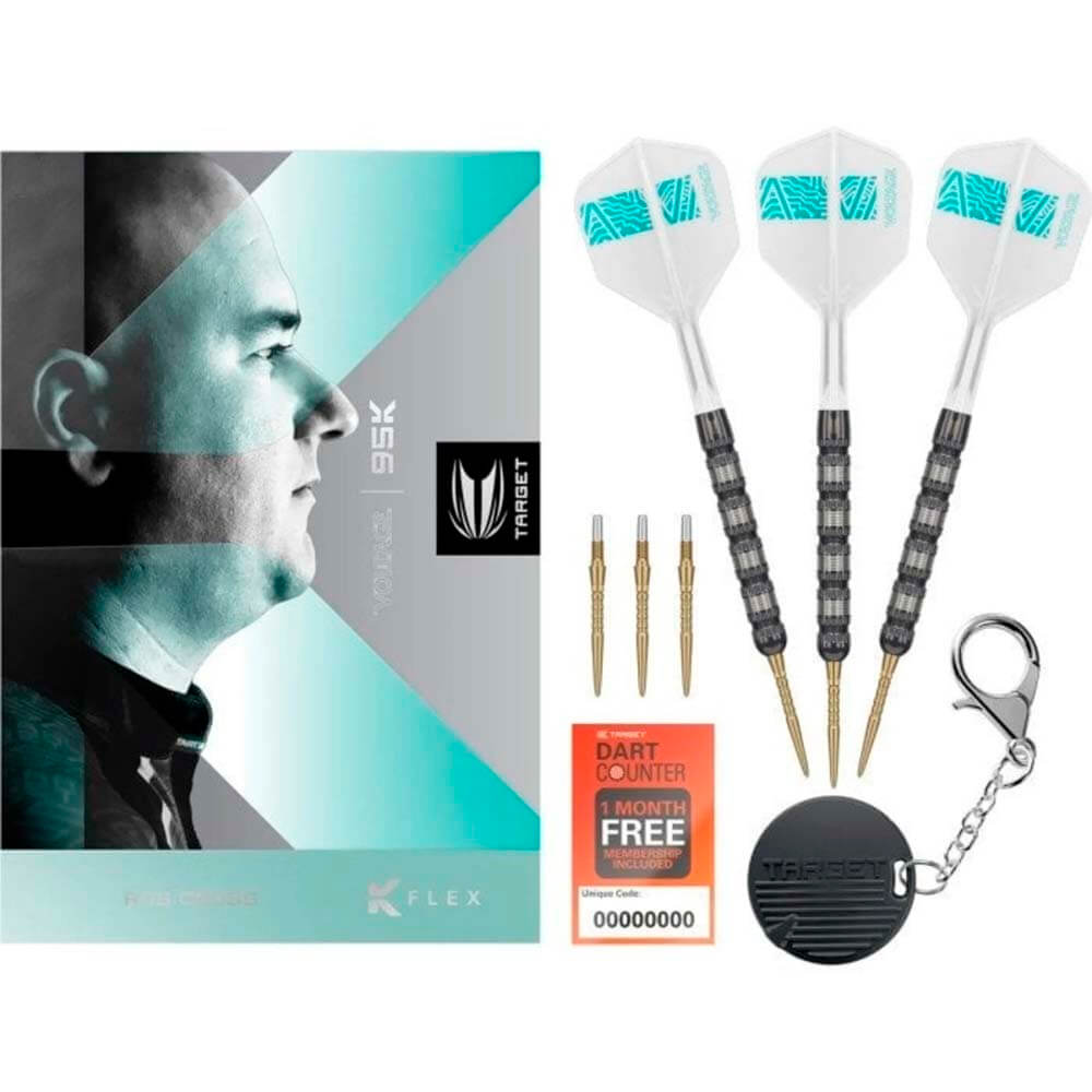 Marca :Target Darts. Modelo: Rob Cross 95K Swiss Point. Peso: 21g. Tipo punta: Metal Swiss Point. Material: 95%. Largo Barril: 48mm. Grosor: 6.4mm. . El producto se compone por 1 set de 3 cuerpo modelo Rob Cross 95K, 1 set de 3 cañas Target Darts, 1 set de 3 plumas y set de 3 puntas Swiss Point