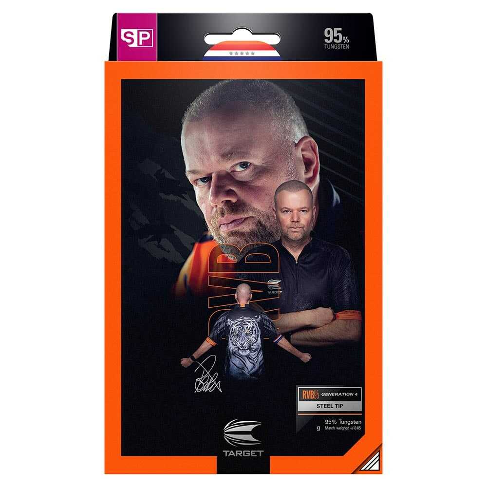 Dardos Target Raymond Van Barneveld Gen4 SP Steel 95% 21gr. . Marca: Target. Modelo: Raymond Van Barneveld Gen4. Longitud: 47mm. Diámetro: 7.0mm. Peso del barril: 21 Gr. Peso total: 22.5 Gr aprox. Material: 95% Tungsteno . Tipo de punta: Swiss Point de 26mm, punta de metal con rosca fina interior.. . El juego se compone por 1 set de 3 cuerpos de dardos con punta Swiss Point Raymond Van Barneveld Gen4 21gr, 1 set de 3 cañas Heli Ti Short, 1 set de 3 plumas Pro Ultra y 1 herramienta Swiss Point Tool que te permite cambiar las puntas más fácilmente.