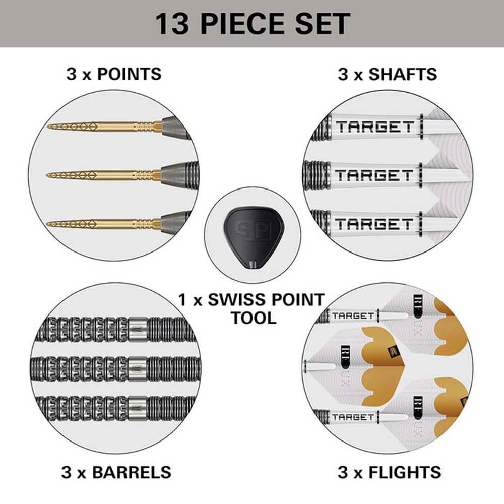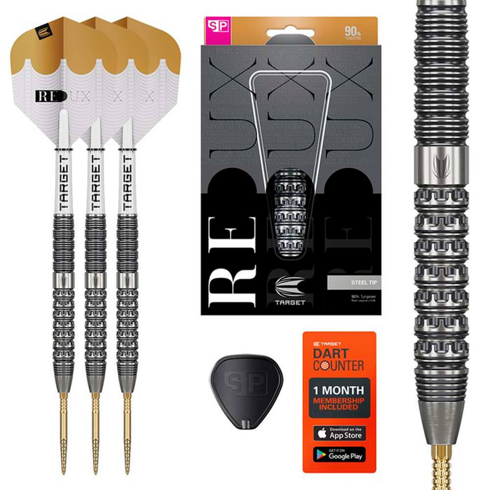 Marca: Target. Modelo: Redux 01. Longitud: 53.0mm. Diámetro: 6.8mm. Peso del barril: 25gr. Material: 90% Tungsteno . Tipo de punta: Punta de metal reemplazable con rosca Target Swiss. . El juego se compone por . 1 set de 3 cuerpos de dardos Target Redux. 1 set de 3 puntas Target Swiss Point. 1 set de 3 cañas Pro Grip. 1 set de 3 plumas Pro Ultra No6. 1 herramienta Swiss Point para cambiar las puntas fácilmente. 1 suscripción mensual a la aplicación DartCounter