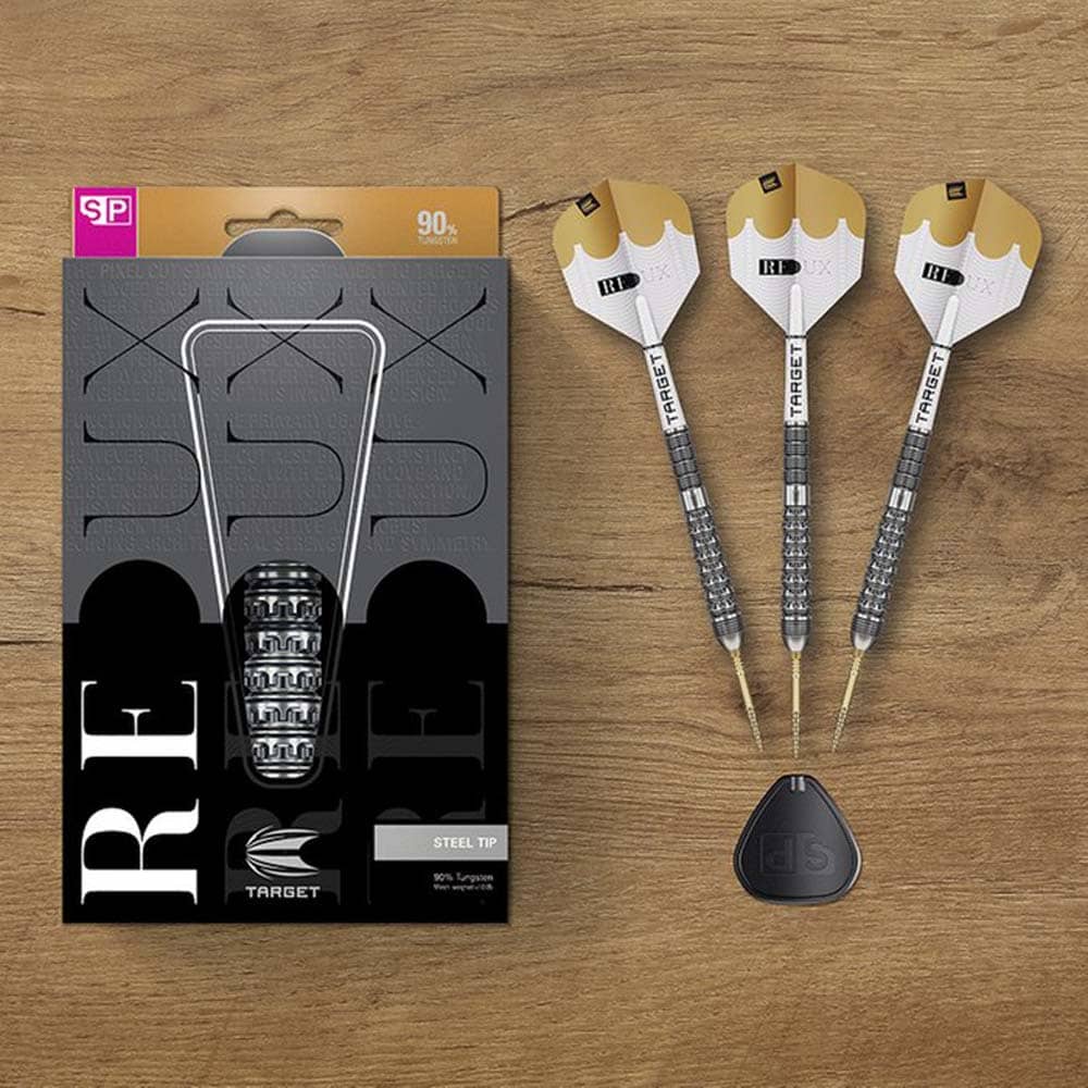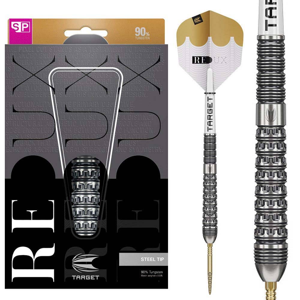 Marca: Target. Modelo: Redux 03. Longitud: 52.0mm. Diámetro: 7.6mm. Peso del barril: 26gr. Material: 90% Tungsteno . Tipo de punta: Punta de metal reemplazable con rosca Target Swiss. . El juego se compone por . 1 set de 3 cuerpos de dardos Target Redux. 1 set de 3 puntas Target Swiss Point. 1 set de 3 cañas Pro Grip. 1 set de 3 plumas Pro Ultra No6. 1 herramienta Swiss Point para cambiar las puntas fácilmente. 1 suscripción mensual a la aplicación DartCounter