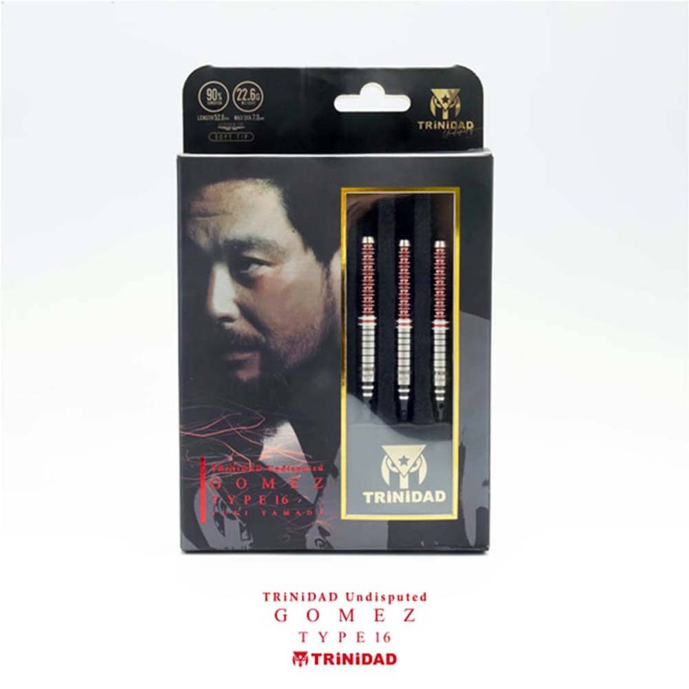 Marca: Trinidad. Modelo: Gomez Type16. Diseño: Yuki Yamada. Peso del barril: 22.8gr. Material: 90% Tungsteno. Longitud barril: 52.0mm. Diámetro barril: 6.5mm. Tipo de punta: Metal – Steel Tip. . El juego de dardos se compone por 1 set de 3 cuerpos Gomez Type16 con punta de acero, 1 set de 3 plumas Trinidad y 1 set de 3 cañas Trinidad.