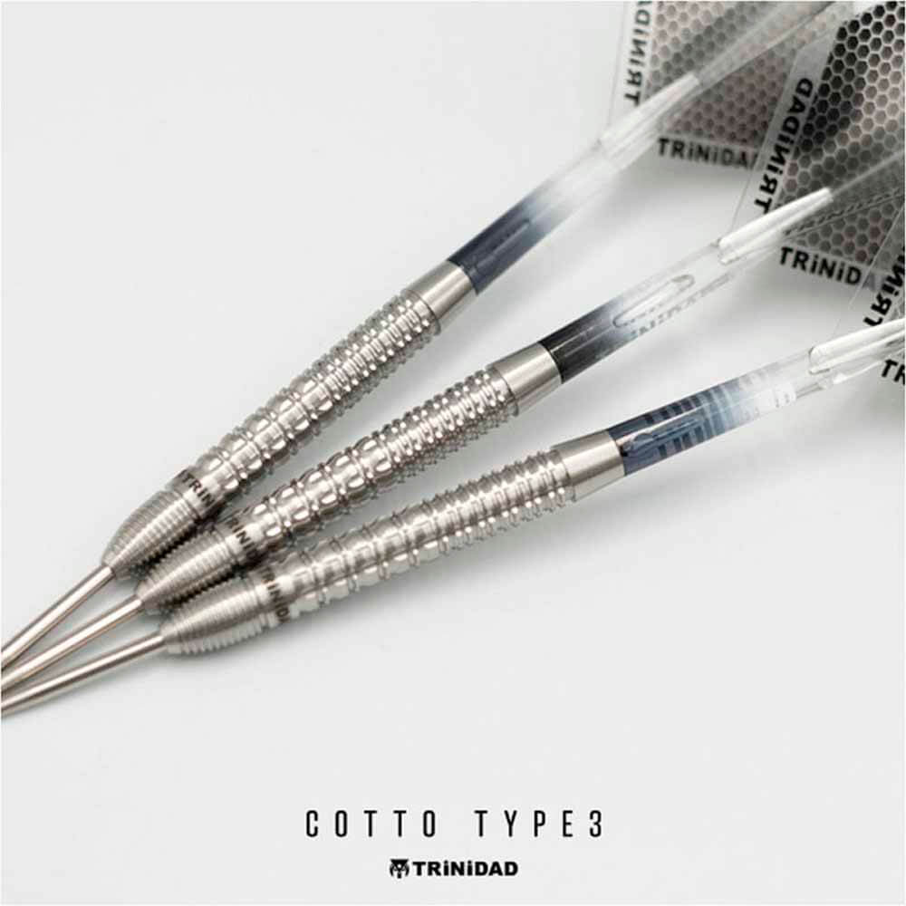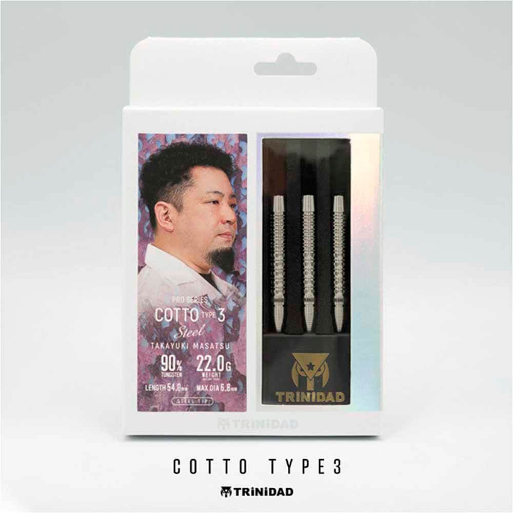 Marca: Trinidad. Modelo: Cotto Type 3 Masatsu Takayuk. Material: 90% Tungsteno. Peso: 22 g.. Longitud total: 54 mm.. Diámetro máximo: 6,8 mm.. Tipo de punta: Metal Steel Tip. . El juego de dardos se compone por 1 set de 3 cuerpos Cotto Type 3 Masatsu Takayuk , 1 set de 3 plumas Trinidad y 1 set de 3 cañas Trinidad.
