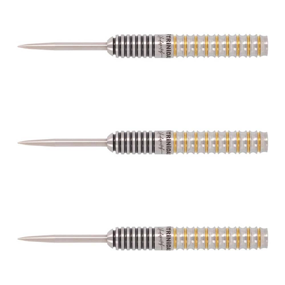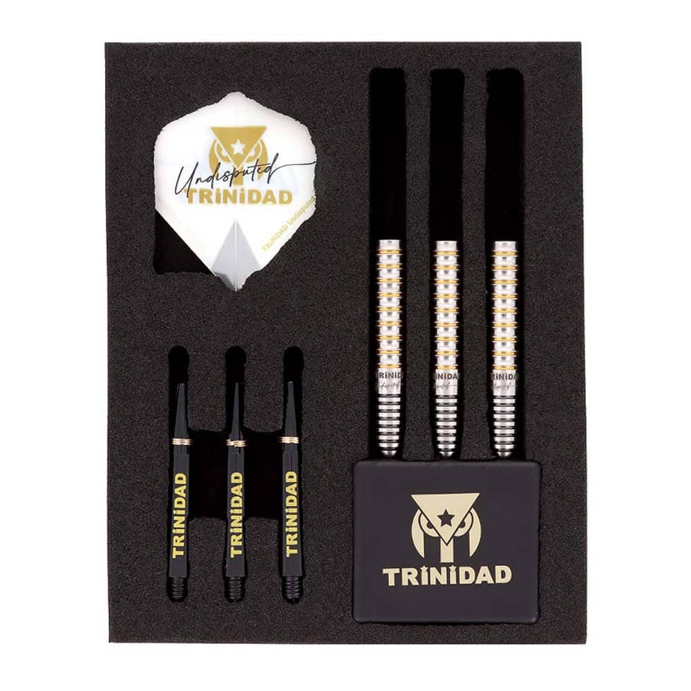 Marca: Trinidad. Modelo: Undisputed KID Type3. Diseño: Tomoya Goto. Peso del barril: 24gr. Material: 95% Tungsteno. Longitud barril: 46.0mm. Diámetro barril: 6.8mm. Tipo de punta: Acero – Steel Tip. . El juego de dardos se compone por 1 set de 3 cuerpos Trinidad Undisputed KID Type3 con punta de acero, 1 set de 3 plumas Trinidad y 1 set de 3 cañas Trinidad.