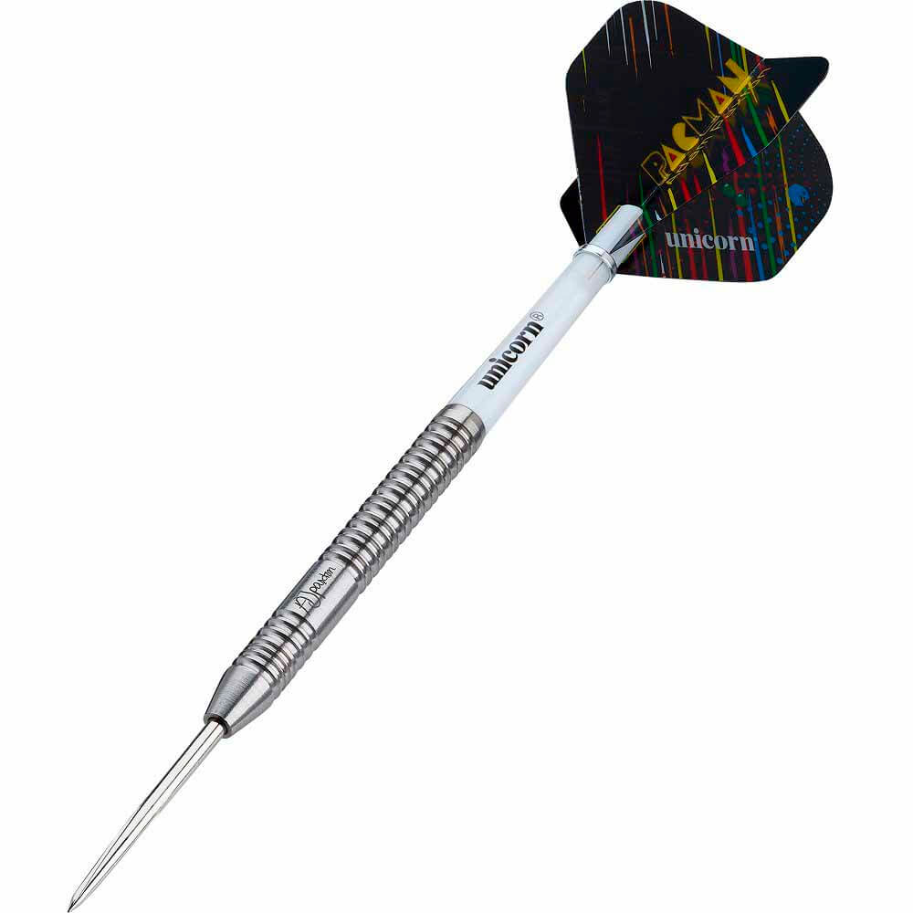 Marca: Unicorn. Modelo: Adam Paxton. Material: 90% Tungsteno. Peso barril: 23gr. Peso total: 21.5gr aprox. Longitud barril: 53.3mm. Diámetro barril: 6.4mm . Tipo de punta: Metal – Steel Tip. Rosca de la caña: 2ba 4mm. . El juego de dardos Unicorn Adam Paxton se compone por 1 set de 3 cuerpos con punta de metal, 1 set de 3 cañas Unicorn y 1 set de 3 plumas