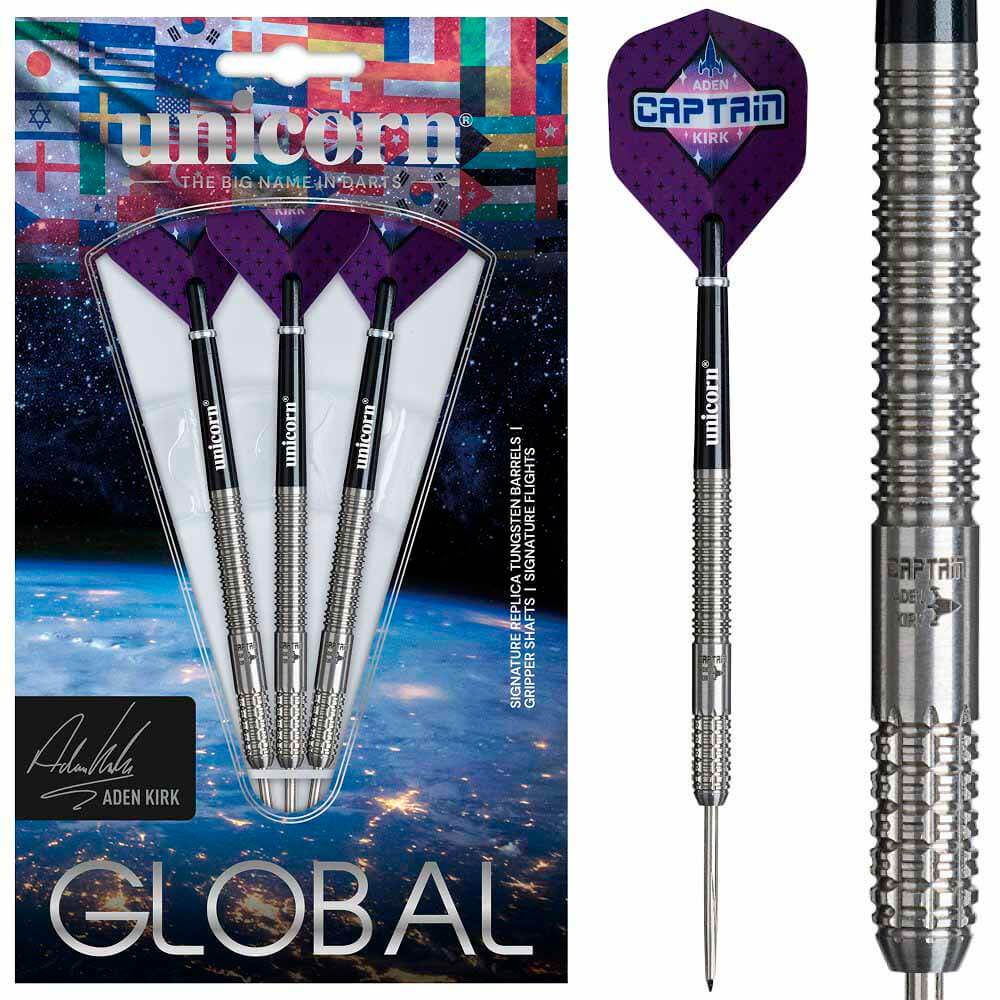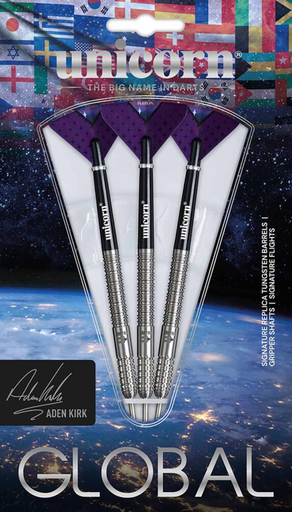 Marca: Unicorn. Modelo: Aden Kirk. Material: 90% Tungsteno. Peso barril: 22gr. Peso total: 21.5gr aprox. Longitud barril: 54.00mm. Diámetro barril: 6.4mm . Tipo de punta: Metal – Steel Tip. Rosca de la caña: 2ba 4mm. . El juego de dardos Unicorn Aden Kirk se compone por 1 set de 3 cuerpos con punta de metal, 1 set de 3 cañas Unicorn y 1 set de 3 plumas