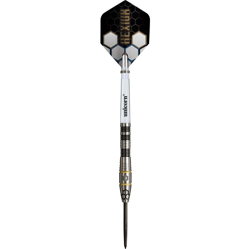 Marca: Unicorn. Gama: Hexium 1. Modelo: Black Gold. Material: 90% Tungsteno. Peso total: 22gr. Peso barril: 20.5gr. Longitud barril: 45.0mm. Diámetro barril: 7.4mm . Tipo de punta: Metal. Rosca de la caña: 2ba 4mm. . El juego de dardos Unicorn Hexium 1 Black Gold se compone por 1 set de 3 cuerpos, 1 set de 3 cañas Unicorn y 1 set de 3 plumas Unicorn