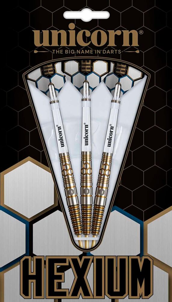 Marca: Unicorn. Gama: Hexium 3. Modelo: Black Gold. Material: 90% Tungsteno. Peso total: 26gr. Peso barril: 24.5gr. Longitud barril: 50.0mm. Diámetro barril: 7.3mm . Tipo de punta: Metal. Rosca de la caña: 2ba 4mm. . El juego de dardos Unicorn Hexium 3 Black Gold se compone por 1 set de 3 cuerpos, 1 set de 3 cañas Unicorn y 1 set de 3 plumas Unicorn