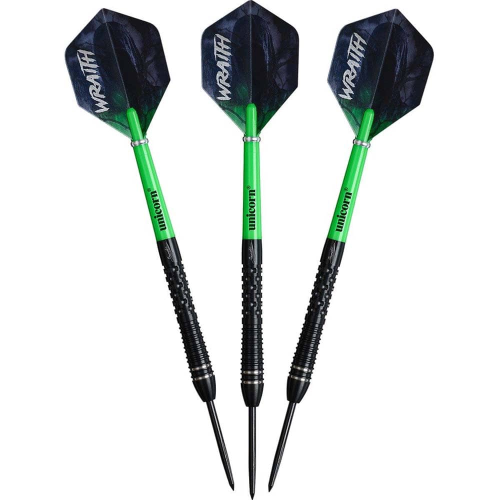 Marca: Unicorn. Modelo: Wraith. Diseño: Gary Anderson P6. Material: 90% Tungsteno. Peso barril: 22gr. Longitud barril: 48.2mm. Diámetro barril: 7.3mm . Tipo de punta: Metal – Steel Tip. Rosca de la caña: 2ba 4mm. . El juego de dardos Unicorn Wraith Gary Anderson P6 se compone por 1 set de 3 cuerpos con punta de metal, 1 set de 3 cañas Unicorn y 1 set de 3 plumas Unicorn