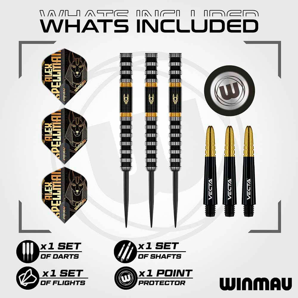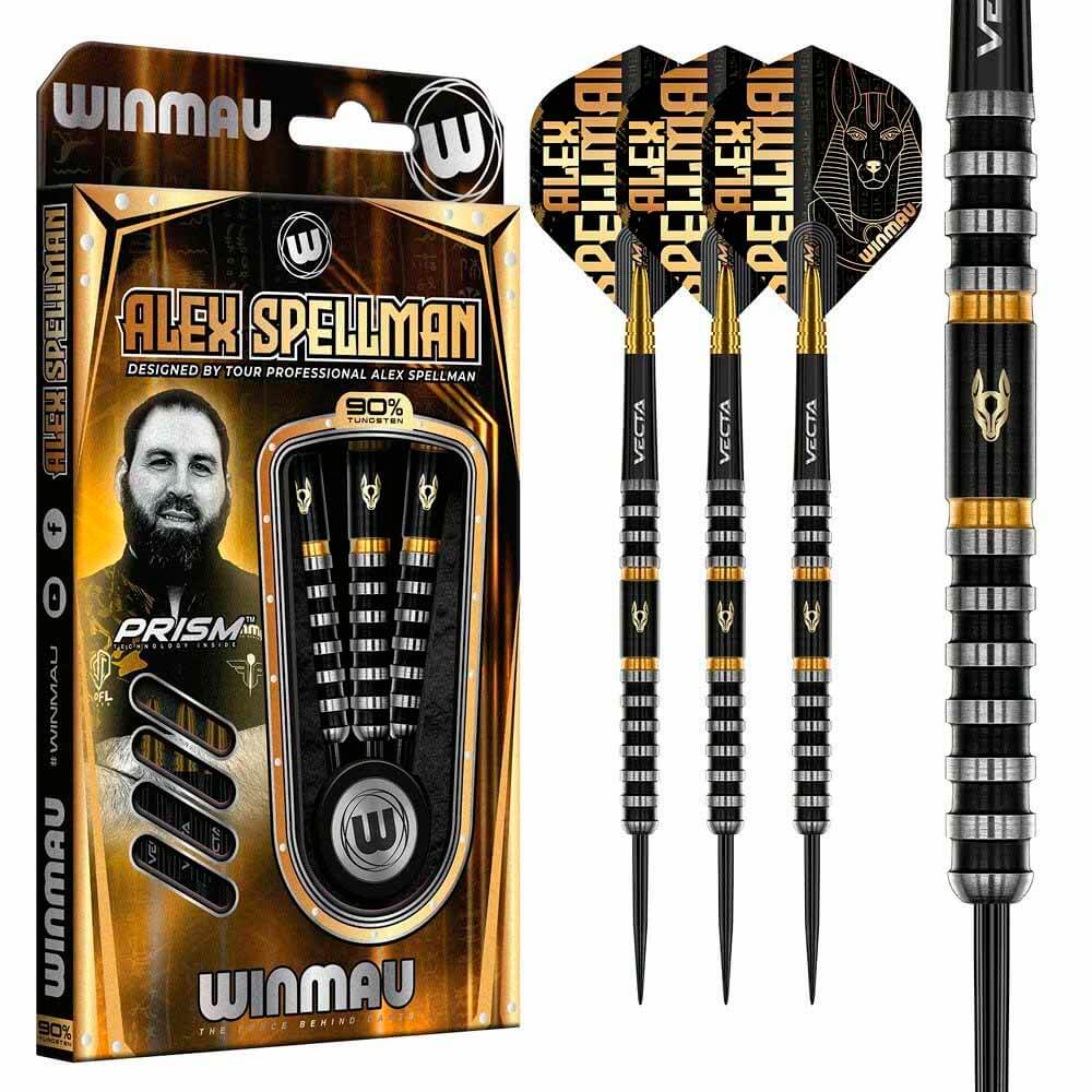 Marca: Winmau. Modelo: Alex Spellman. Material: 90% Tungsteno. Peso barril: 22gr. Peso total: 20.5gr aprox. Longitud barril: 54.60mm. Diámetro barril: 6.06mm. Tipo de punta: Metal. Rosca de la caña: 2ba 4mm. . El juego de dardos Winmau Alex Spellman se compone por 1 set de 3 cuerpos con punta de metal, 1 set de 3 cañas y 1 set de 3 plumas.