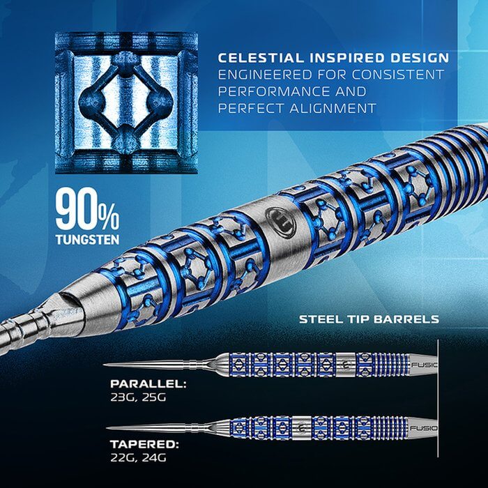 Peso total: 24g. Punta: Steel Tip. Largo total: 50.8mm. Diámetro: 6.5mm. Rosca caña: 2ba 4mm . Tungsteno: 90%. Tecnología Innovadora Switch Point. . El producto se compone de por 1 set de 3 cuerpos Exion Tapered de la marca Winmau Darts, 1 set de plumas Fusion Winmau y dos juegos de puntas intercambiables (wave y smooth) Gracias a la tecnología Switch Point, estos dardos permiten cambiar las puntas de forma rápida y sencilla, adaptándose fácilmente a distintos estilos de juego y tipos de diana. Ya sea con puntas lisas o ranuradas, el sistema facilita una personalización total sin complicaciones.Con un peso de 22 gramos, 50,8 mm de longitud y 6,65 mm de diámetro máximo, los Winmau Lunaris Tapered se adaptan tanto a jugadores avanzados como a quienes buscan mejorar su rendimiento. El conjunto se entrega con el Fusion Integrated Flight System, listo para competir desde el primer lanzamiento. Gracias a la tecnología Switch Point, estos dardos permiten cambiar las puntas de forma rápida y sencilla, adaptándose fácilmente a distintos estilos de juego y tipos de diana. Ya sea con puntas lisas o ranuradas, el sistema facilita una personalización total sin complicaciones.Con un peso de 22 gramos, 50,8 mm de longitud y 6,65 mm de diámetro máximo, los Winmau Lunaris Tapered se adaptan tanto a jugadores avanzados como a quienes buscan mejorar su rendimiento. El conjunto se entrega con el Fusion Integrated Flight System, listo para competir desde el primer lanzamiento.