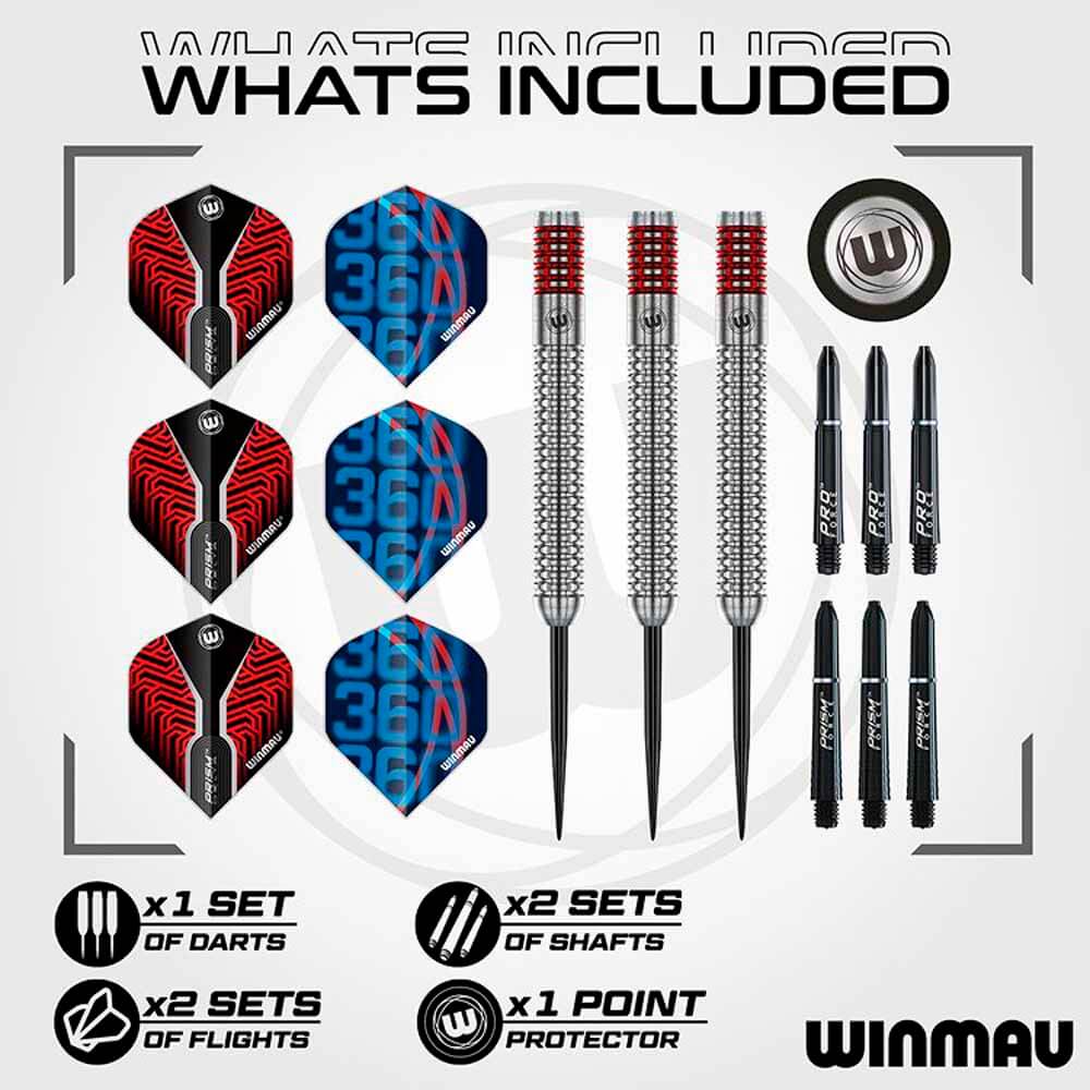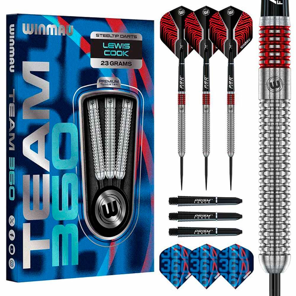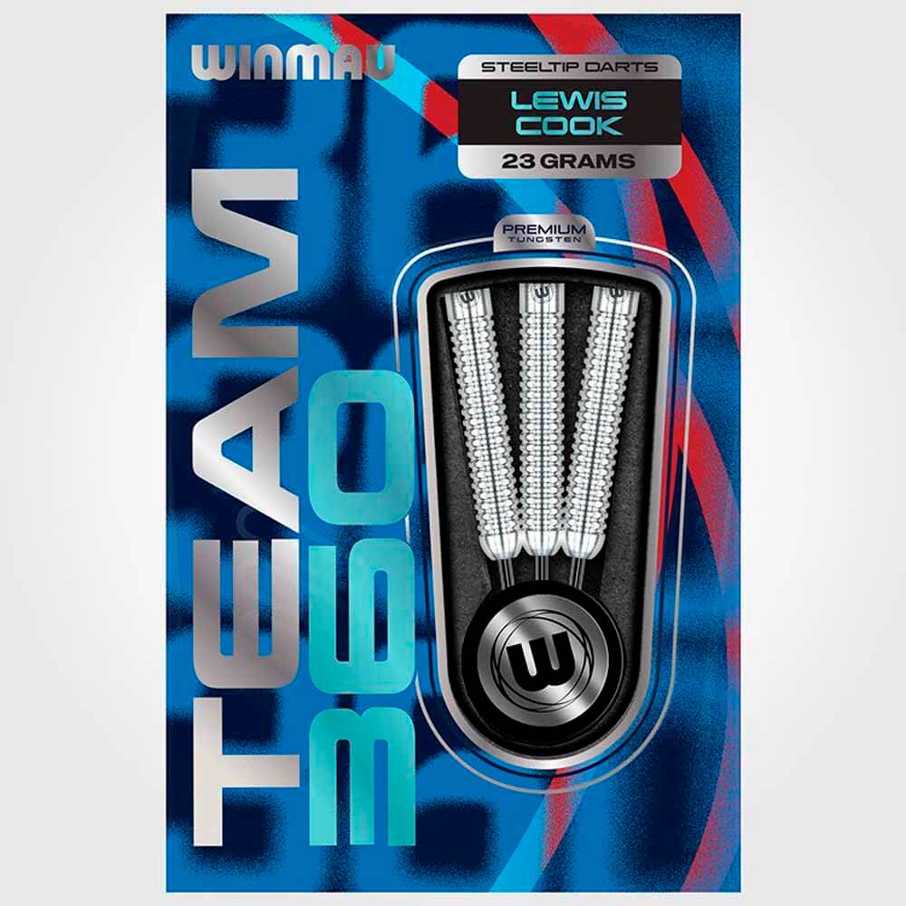 Marca: Winmau. Modelo: Team 360 Lewis Cook. Material: 90% Tungsteno. Peso barril: 23gr. Peso total: 21.5gr aprox. Longitud barril: 50.8mm. Diámetro barril: 6.55mm. Tipo de punta: Metal. Rosca de la caña: 2ba 4mm. . El juego de dardos Winmau Team 360 Lewis Cook se compone por 1 set de 3 cuerpos con punta de metal, 1 set de 3 cañas , 1 set de 3 plumas y 1 protector de puntas de metal.