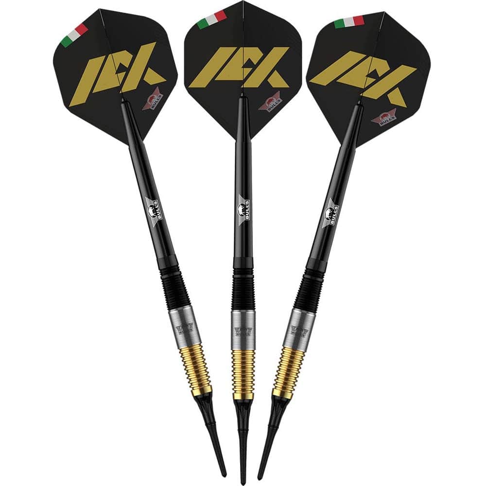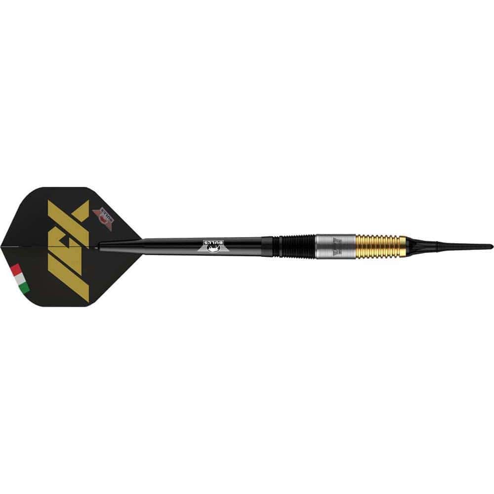 Marca: Bulls DE. Modelo: Massimo Dalla-Rosa. Material: 90% Tungsteno. Peso total: 20gr. Longitud barril: 42.0mm. Diámetro barril: 7.26mm . Tipo de punta: Plástico rosca 2ba 4mm. Rosca de la caña: 2ba 4mm. . El juego se compone por 1 set de 3 barriles Bulls Darts DE Massimo Dalla-Rosa, 1 set de 3 cañas Bulls B-Grip2 negro, 1 set de 3 plumas Bulls Standard y 3 puntas de plástico Bulls.