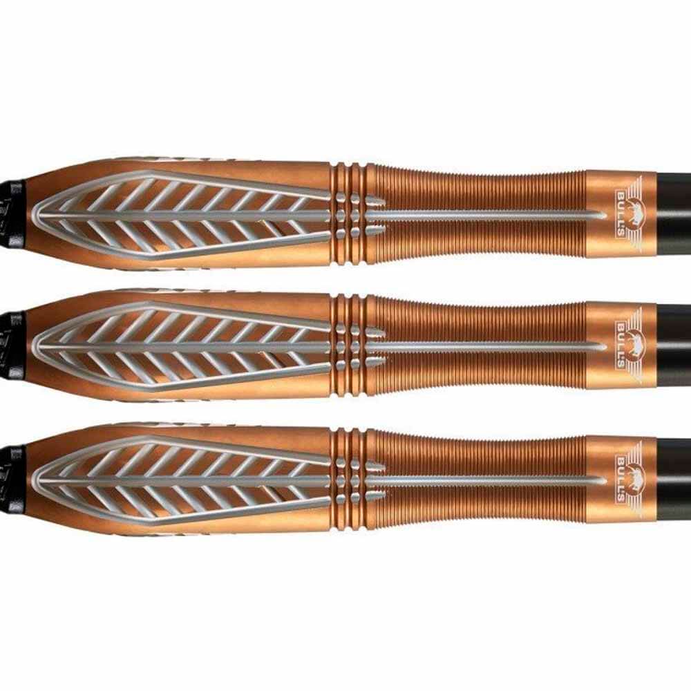 Marca: Bulls Darts. Modelo: Bronzo Nova. Tungsteno 90%. Peso: 20g. Rosca 2ba: 4mm. Largo cuerpo: 45.00mm. Diámetro cuerpo: 6.98mm. . El juego de dardos se compone por 1 set de 3 cuerpos Bronzo Nova, 1 set de 3 cañas Bulls, 1 set de 3 plumas y 1 set de 3 puntas 2ba 4mm
