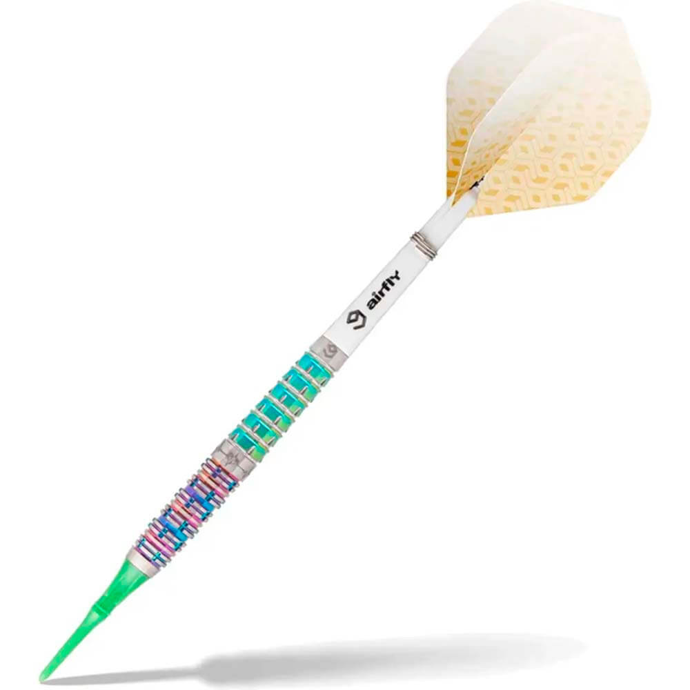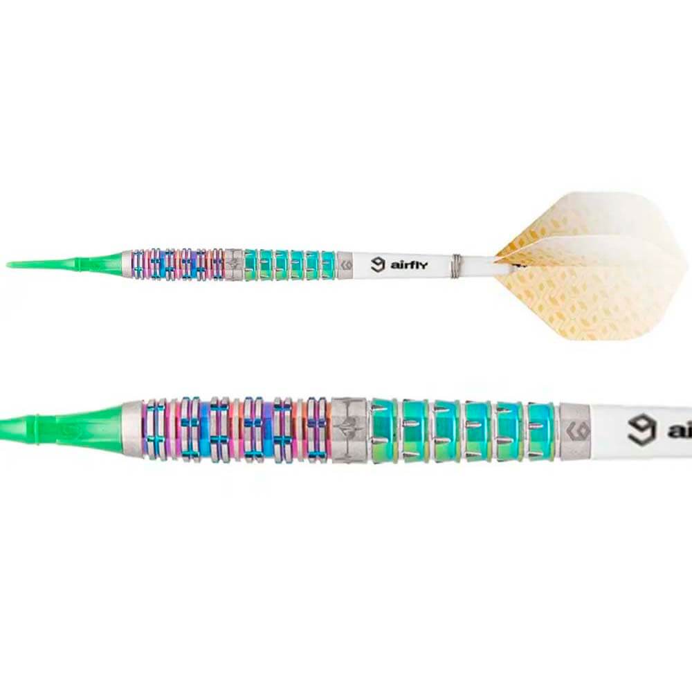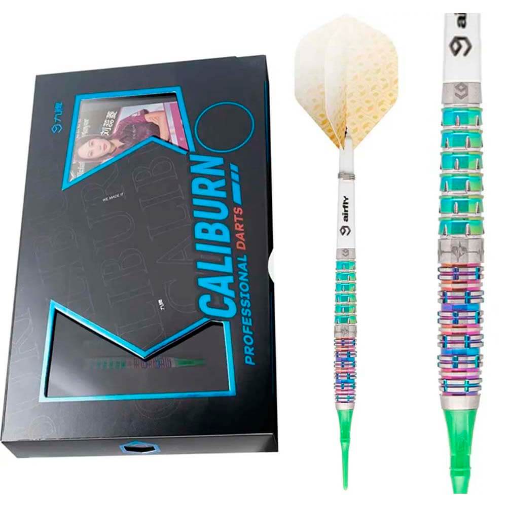 Marca: Caliburn. Gama: Player Darts – Rainbow Coating. Modelo: Raine. Material: 95% Tungsteno. Tipo de punta: Plástico rosca 2ba 4mm. Longitud barril: 48.0mm. Diámetro barril: 7.0mm. Peso barril: 19gr. . El producto se compone por 1 set de 3 cuerpos Caliburn Raine, 1 set de 3 plumas Caliburn, 1 set de 3 cañas Caliburn, 1 set de 3 puntas de plástico Caliburn y 1 tarjeta metálica con la tabla de cierres y la portada de la jugadora Raine.
