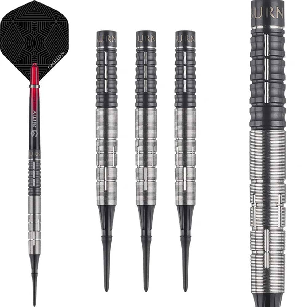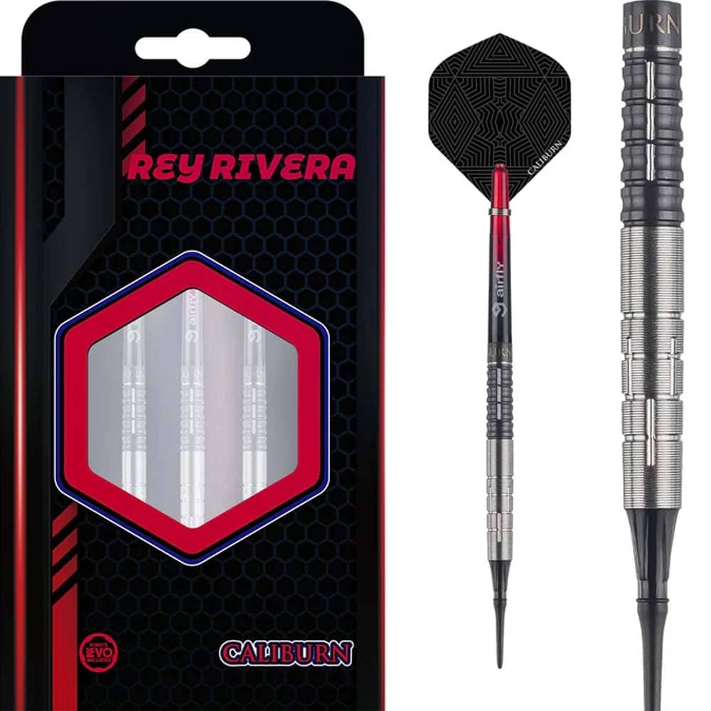 Marca: Caliburn. Gama: Player Darts. Modelo: Rey Rivera. Material: 90% Tungsteno. Tipo de punta: Plástico rosca 2ba 4mm. Longitud barril: 50.0mm. Diámetro barril: 6.4mm. Peso barril: 18gr. . El producto se compone por 1 set de 3 cuerpos Caliburn Rey Rivera, 1 set de 3 plumas Caliburn, 1 set de 3 cañas Caliburn, 1 set de 3 puntas de plástico 2ba Caliburn y 1 protector de puntas.