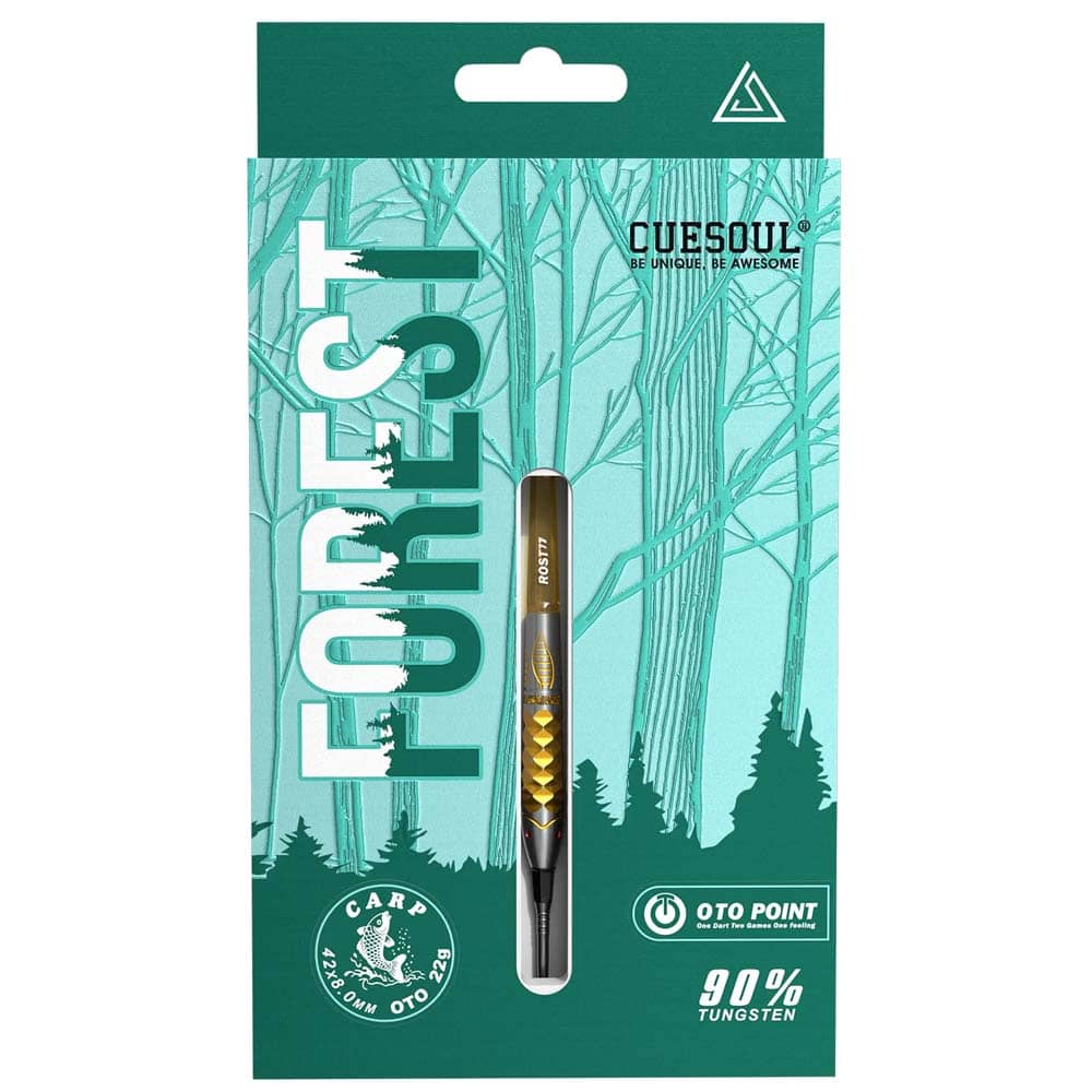 Marca: Cuesoul. Serie: Forest. Modelo: Carp. Punta: Cuesoul OTO rosca 3mm intercambiable. Peso barril: 22g. Longitud barril: 42.0mm. Diámetro barril: 8.0mm. Material: 90% Tungsteno. . El producto se compone por 1 set de 3 cuerpos de dardos Cuesoul Forest, 1 set de 3 Plumas con caña integrada Cuesoul Rost 77, 1 set de 3 puntas de acero OTO, 9 puntas de plástico OTO y 1 piedra de afilar puntas.