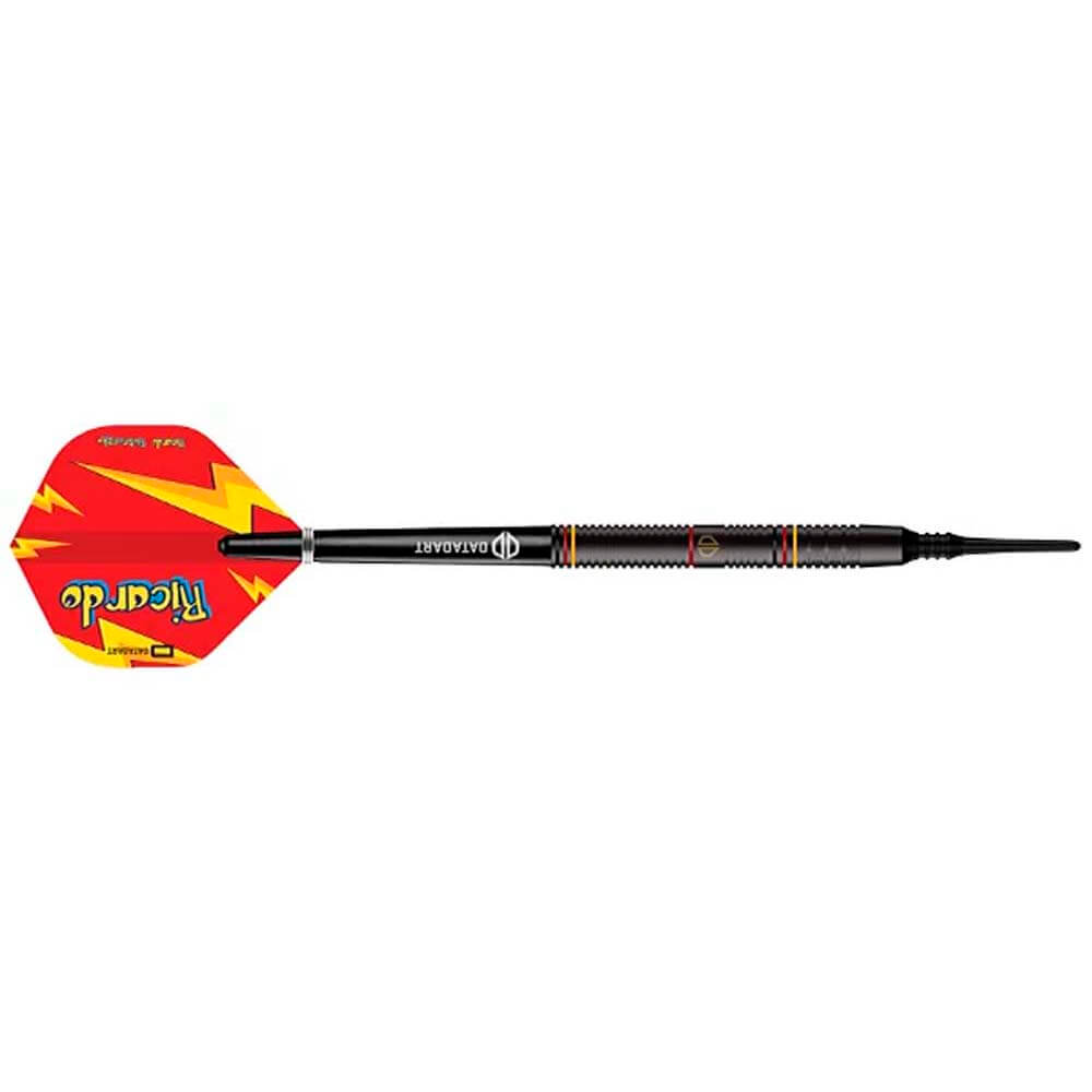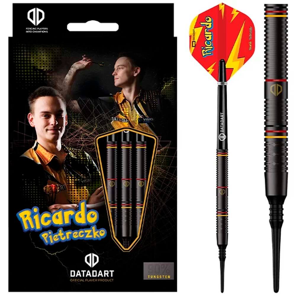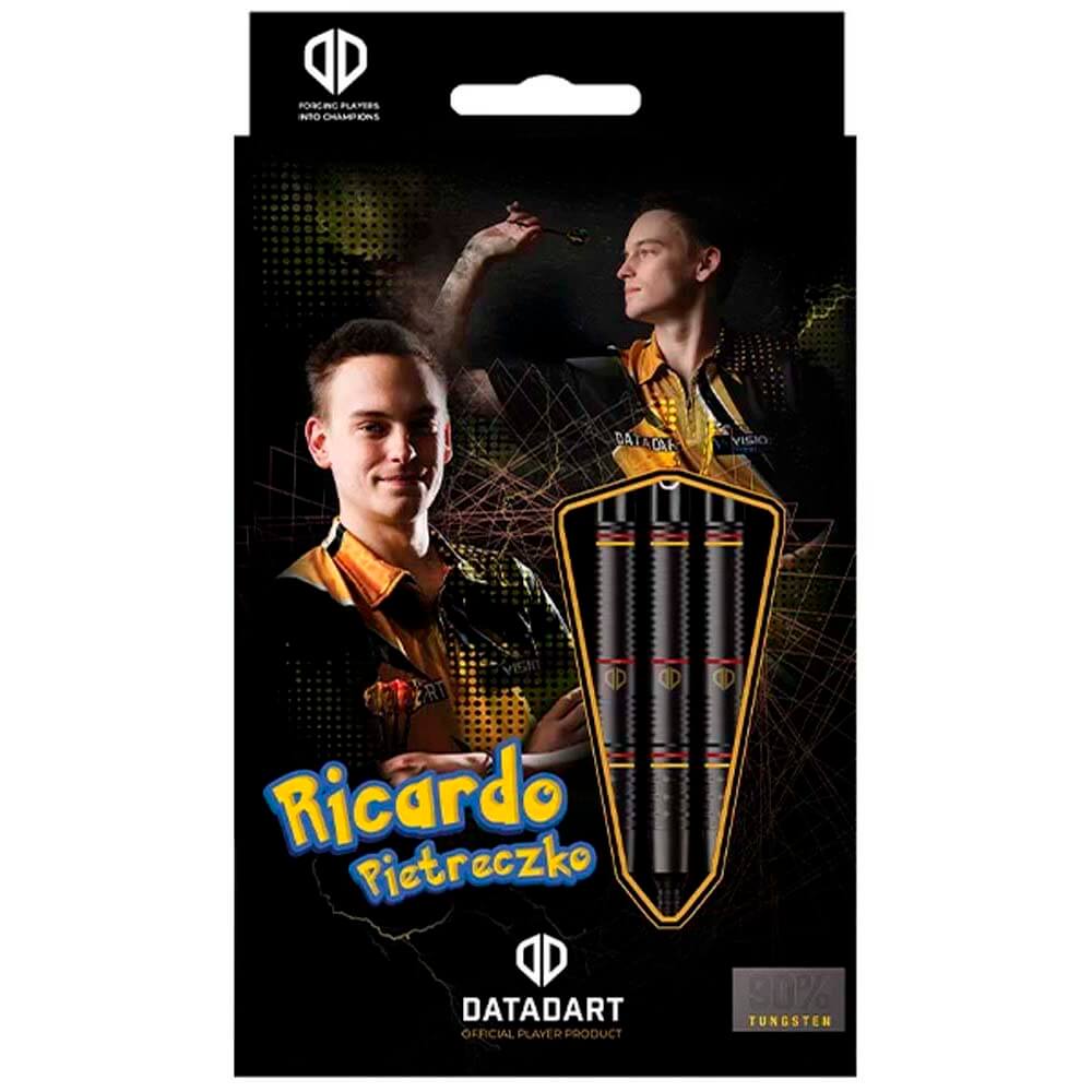 Marca: Datadart. Modelo: Ricardo Pietreczko. Material: 90% Tungsteno. Peso cuerpo: 19g. Peso total aprox: 21g. Punta: Plástico 2ba 4mm. Medida: 51.0mm x 6.4mm . . El juego de dardos se compone por 1 set de 3 cuerpos de dardos Datadart Ricardo Pietreczko, 1 set de 3 cañas, 1 set de 3 plumas y 1 set de 3 puntas.