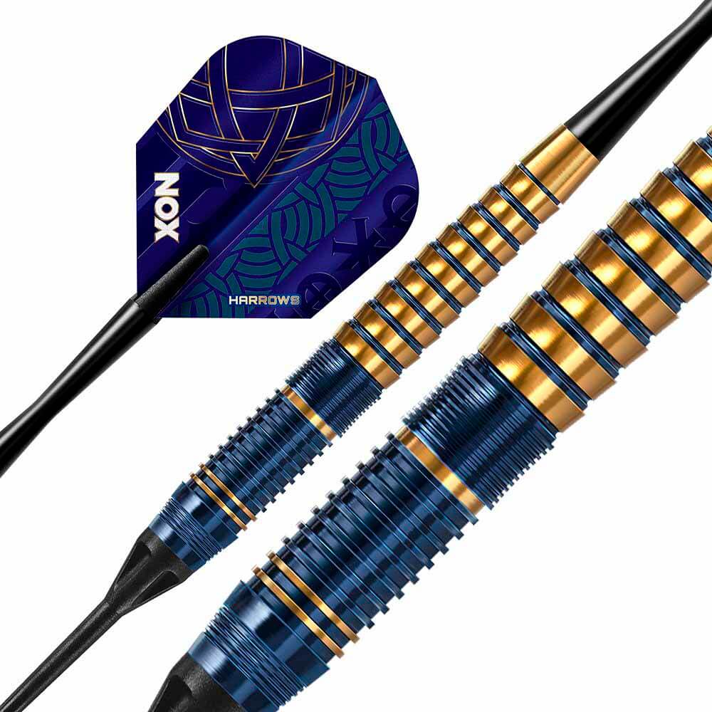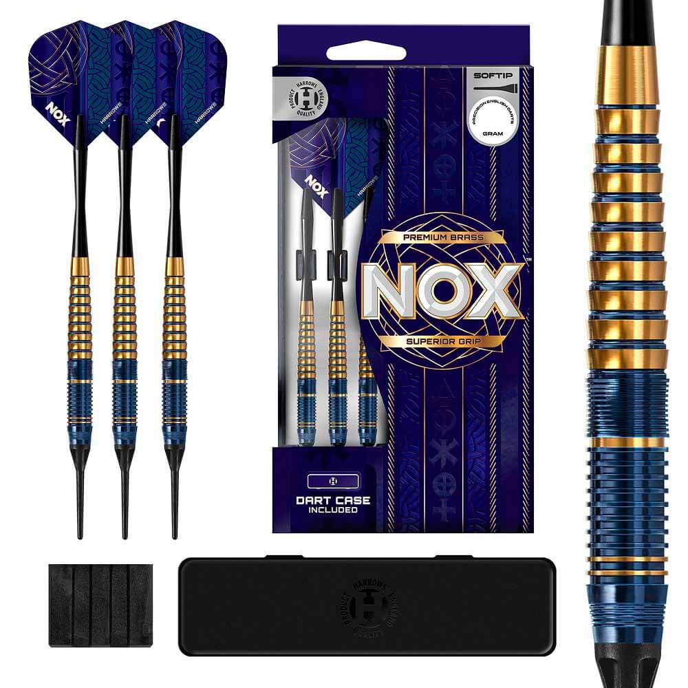 Marca: Harrows Darts.. Modelo: Nox. Version: Brass. Peso: 20 gramos. Punta: Plástico.. Rosca punta: 2BA.. Material: Brass. Medida del cuerpo: 8.8mm x 54mm.. . El dardos se compone por 1 set de 3 cuerpos Harrows Darts Nox , 1 set de 3 cañas Harrows , 1 set de 3 plumas Harrows y 1 set de 3 puntas 2ba 4mm y una caja de plástico rígida negra para transportarlos