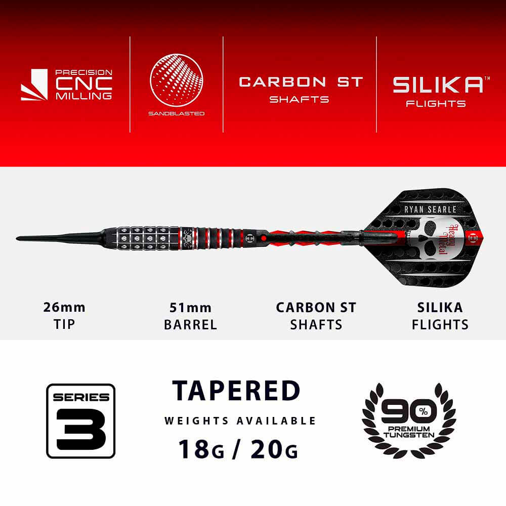 Marca: Harrows Darts.. Modelo: Ryan Searle. Version: V3. Peso: 18 gramos con precisión del 0.05g.. Punta: Plástico.. Rosca punta: 2BA.. Material: 90% de tungsteno.. Medida del cuerpo: 6.6mm x 51mm.. . El dardos se compone por 1 set de 3 cuerpos Harrows Darts Ryan Searle V3 , 1 set de 3 cañas Harrows , 1 set de 3 plumas Harrows y 1 set de 3 puntas 2ba 4mm