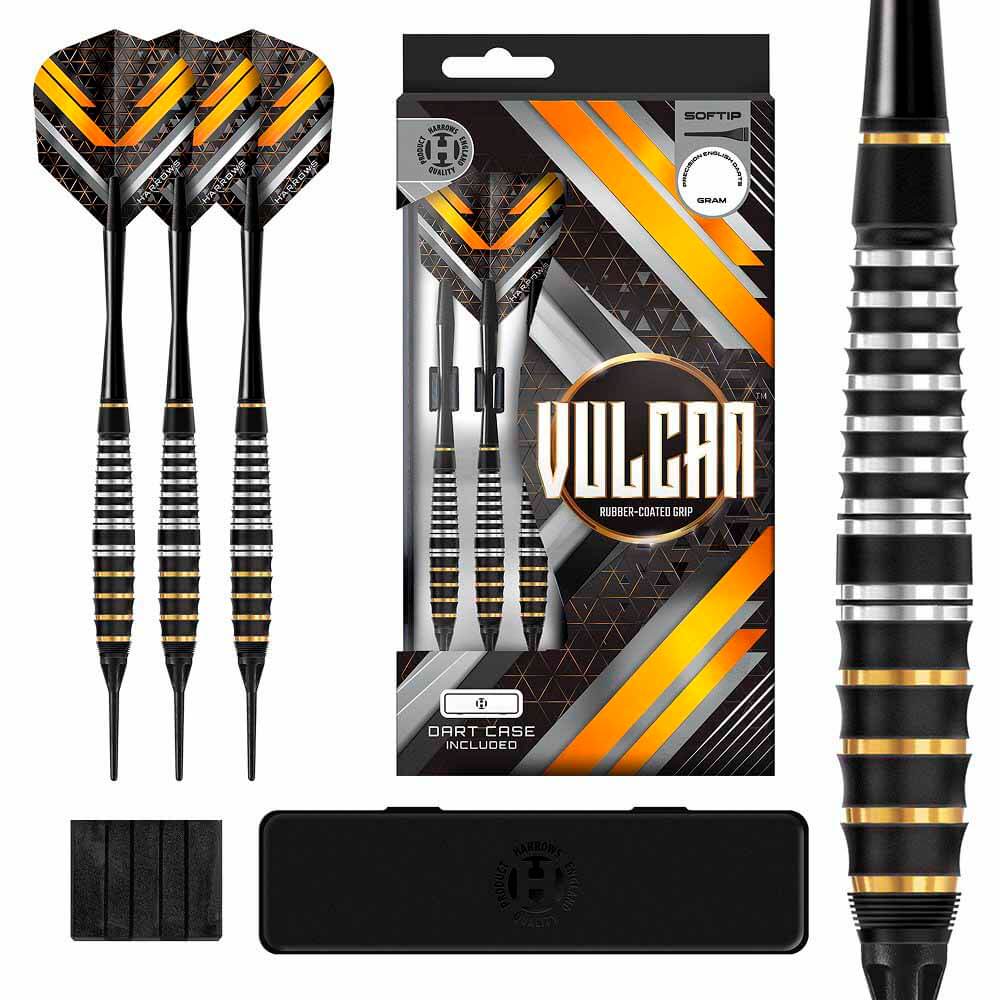 Marca: Harrows Darts.. Modelo: Vulcan . Version: Brass. Peso: 18 gramos. Punta: Plástico.. Rosca punta: 2BA.. Material: Brass. Medida del cuerpo: 8.9mm x 54mm.. . El dardos se compone por 1 set de 3 cuerpos Harrows Darts Vulcan , 1 set de 3 cañas Harrows , 1 set de 3 plumas Harrows y 1 set de 3 puntas 2ba 4mm y una caja de plástico rígida negra para transportarlos