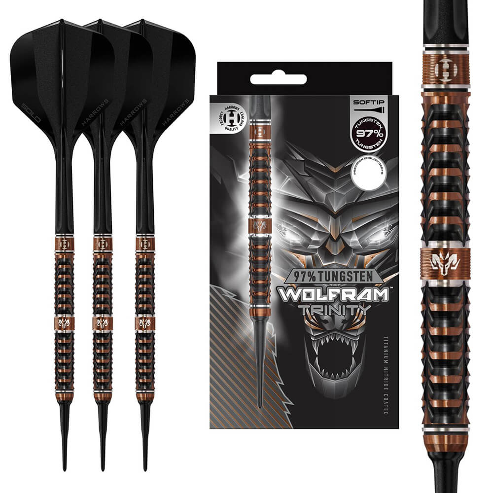 Longitud :51mm. Diámetro :6.3mm. Peso total: 18 gramos. Porcentaje de Tungsteno: 97%. El juego de dardos se compone por 1 set de 3 cuerpos Harrows Wolfram Trinity , 1 set de 3 cañas supergrip, 1 set de 3 plumas y 1 set de 3 puntas 2ba 4mm