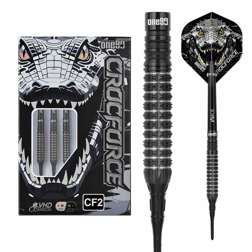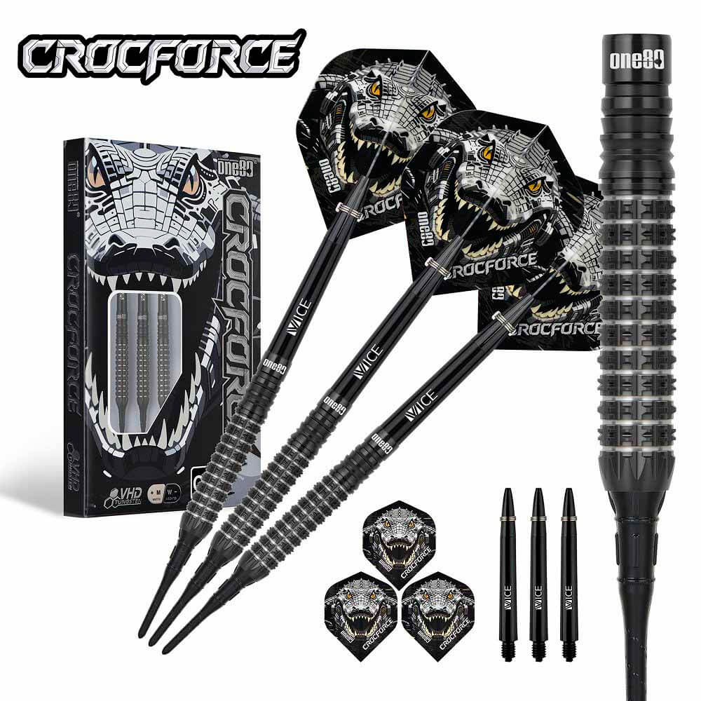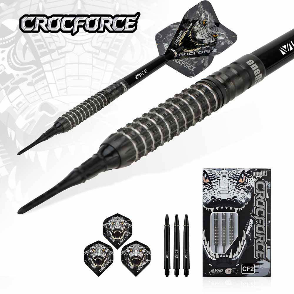 Marca: One 80. Modelo: Crocforce. Version: CF2. Largo Barril: max 41.0mm. Diámetro Barril: max 7.2mm. Peso del cuerpo: 18 gramos. Material Barril: 90% Tungsteno. . El juego de dardos Crocforce CF2 se compone por 1 set de 3 cuerpos, 1 set de 3 cañas , 1 set de 3 plumas y 1 set de 3 puntas 2ba.